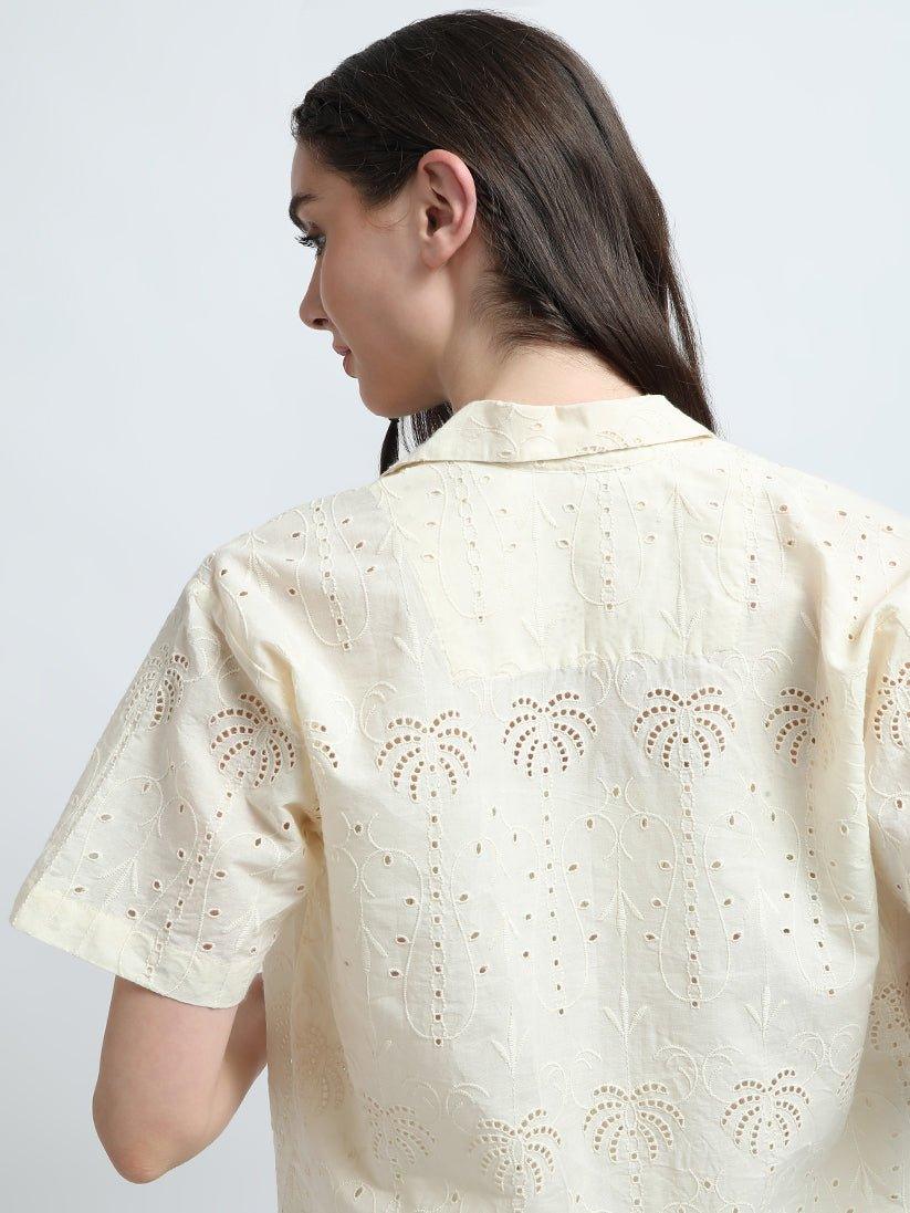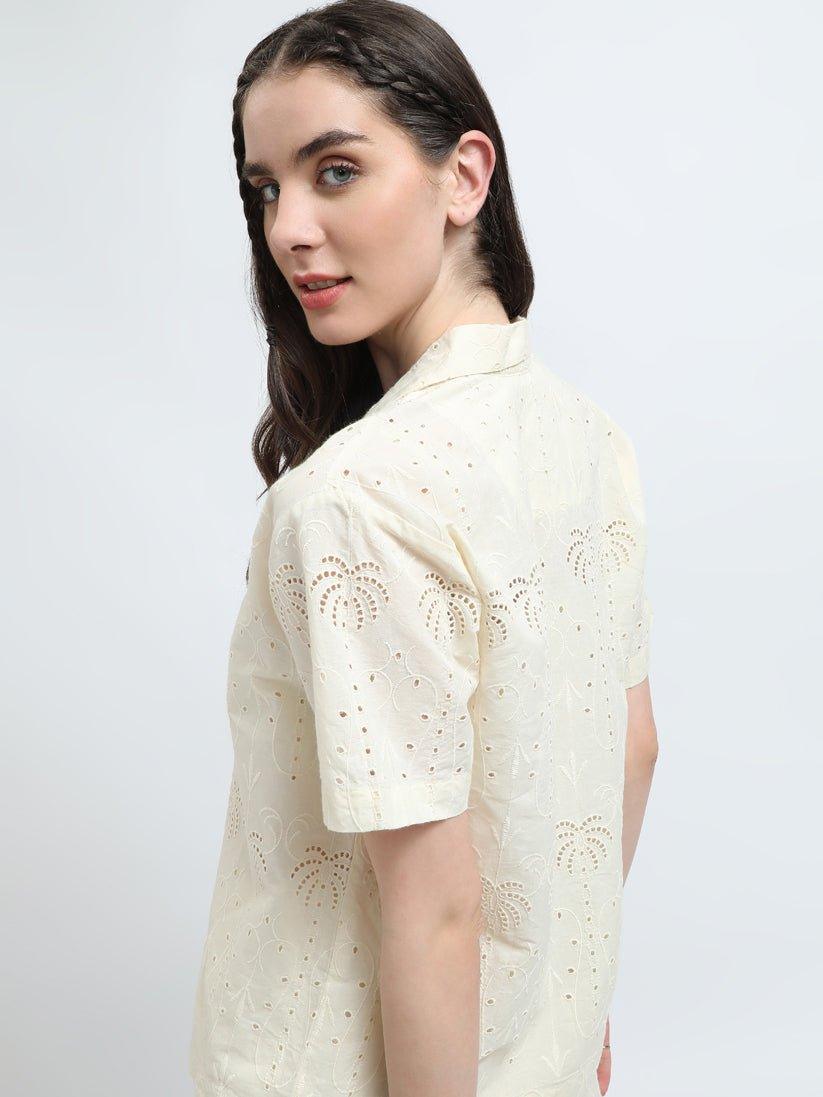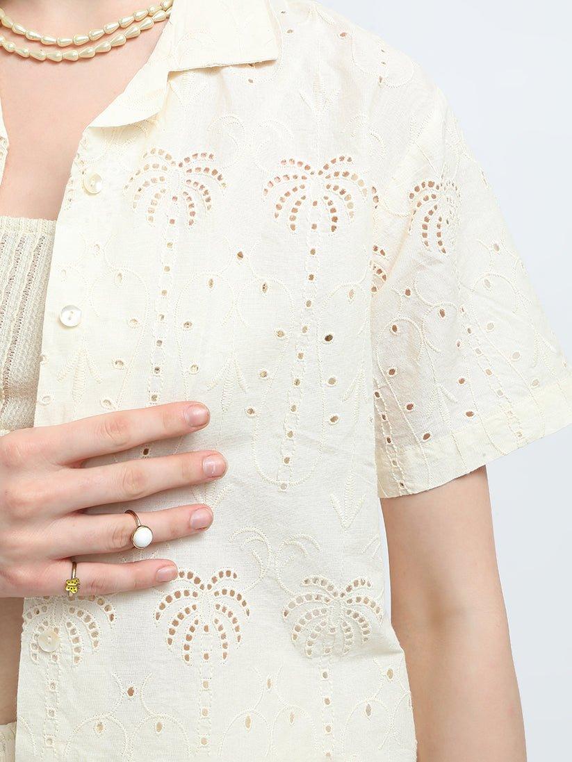 This elegant co-ord set features a delicate lace fabric in a timeless ivory color.