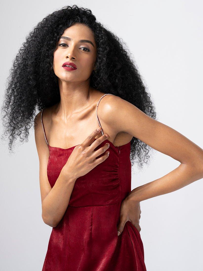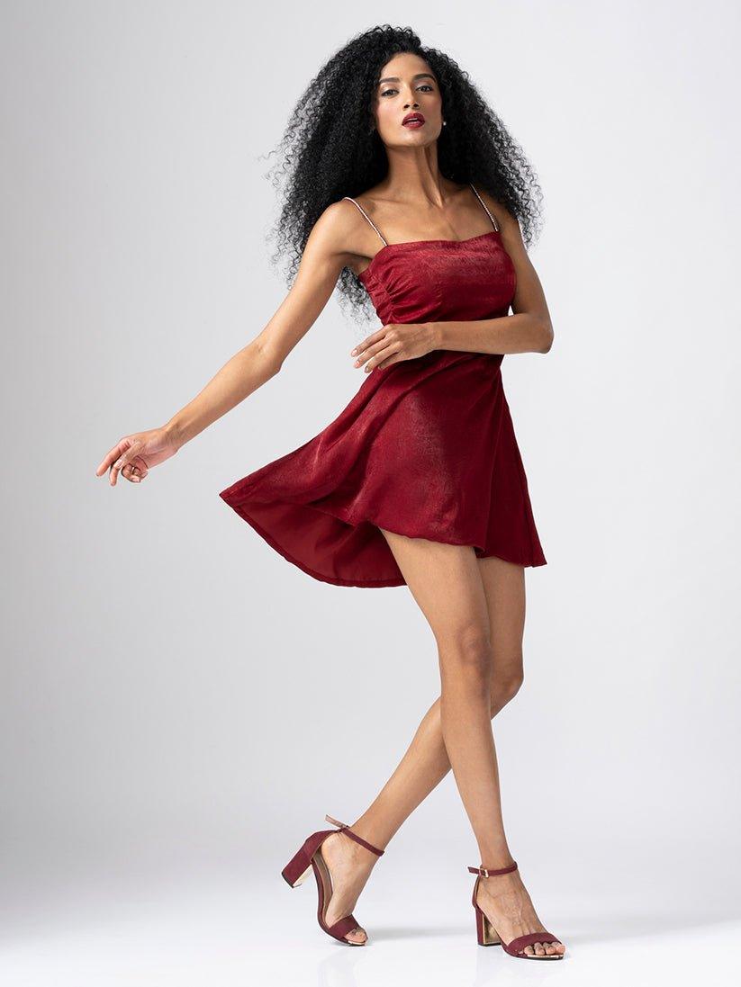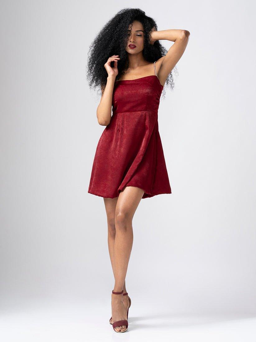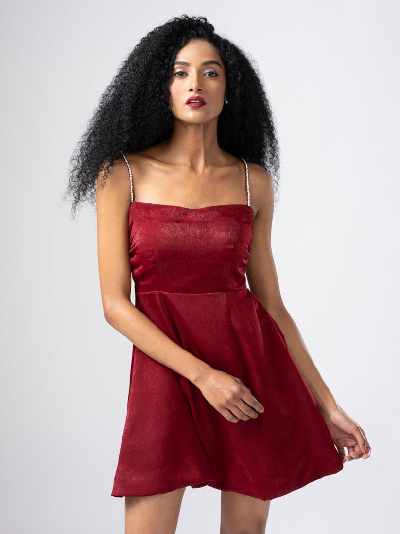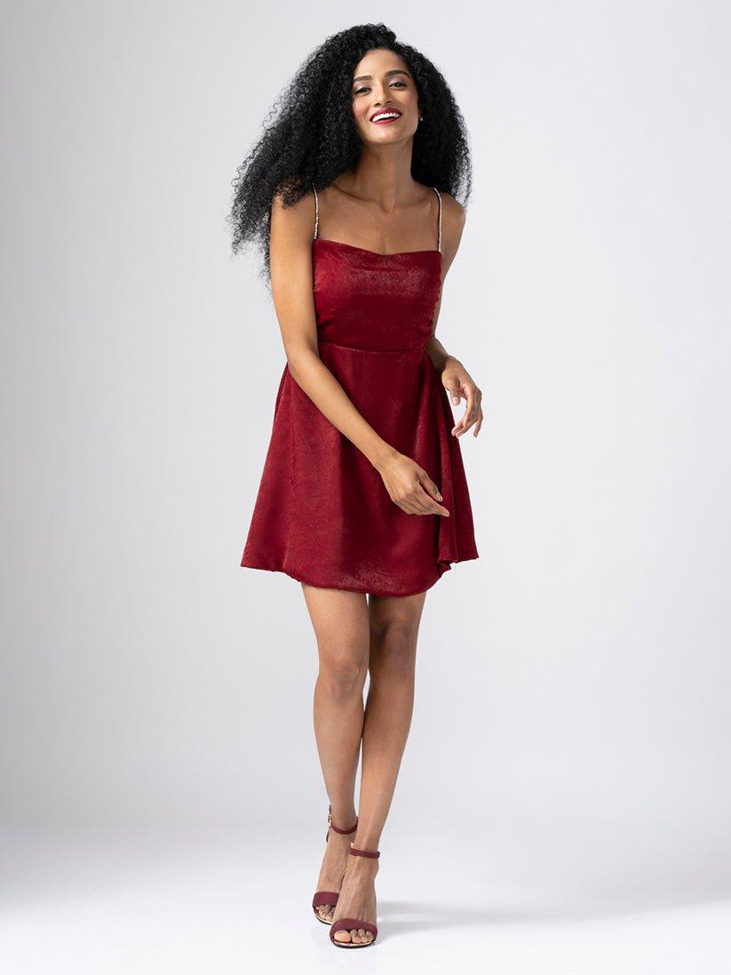 The Crys Dress is a stunning and luxurious piece featuring a classic A-line silhouette and a rich cherry red velvet fabric. The rhinestone straps add a touch of glamour and sparkle, making this dress perfect for special occasions.