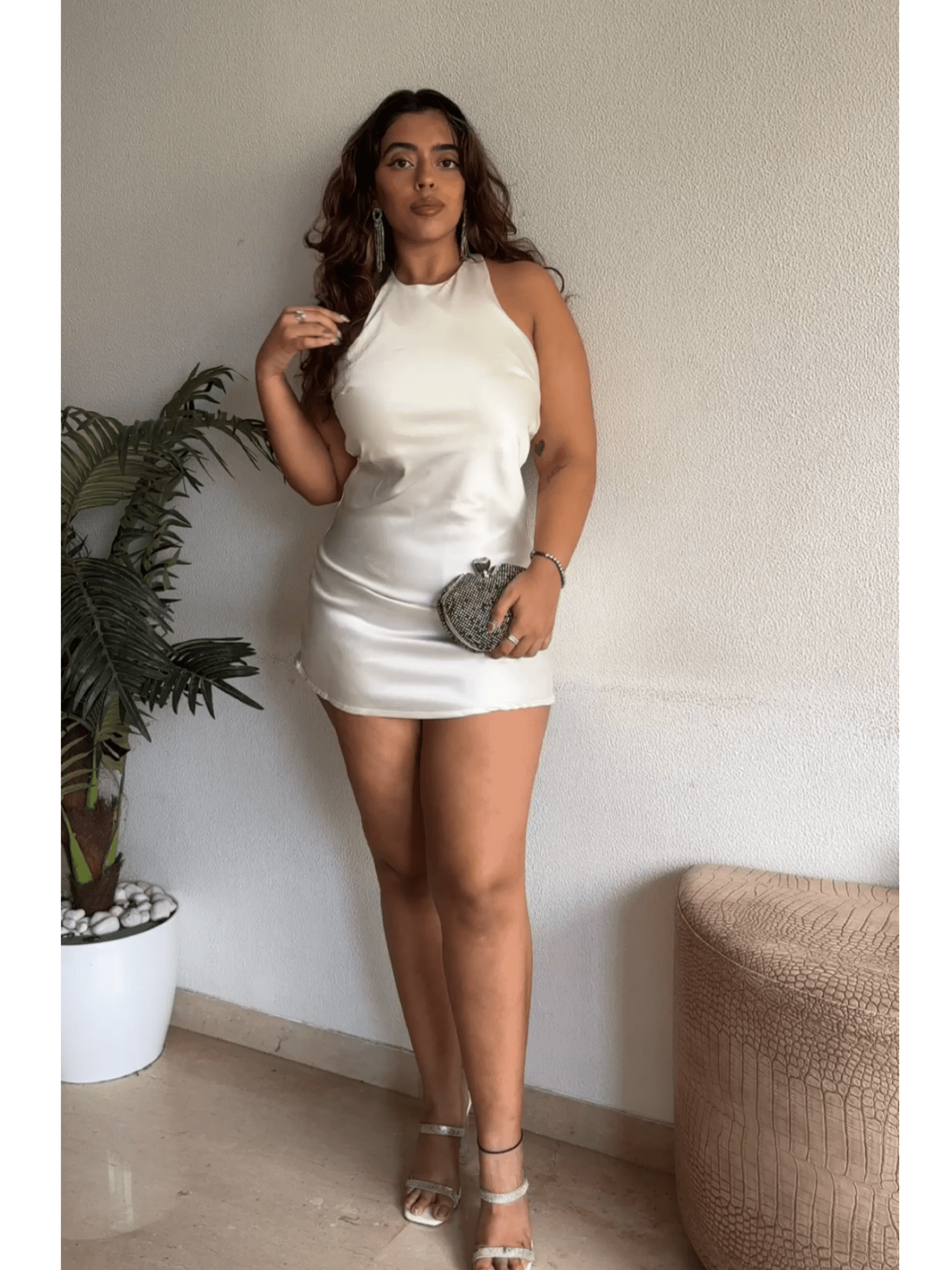 The Dove Dress is a sophisticated and elegant piece in a timeless white color. Featuring a halter neck and backless design, this dress offers a daring and alluring look.