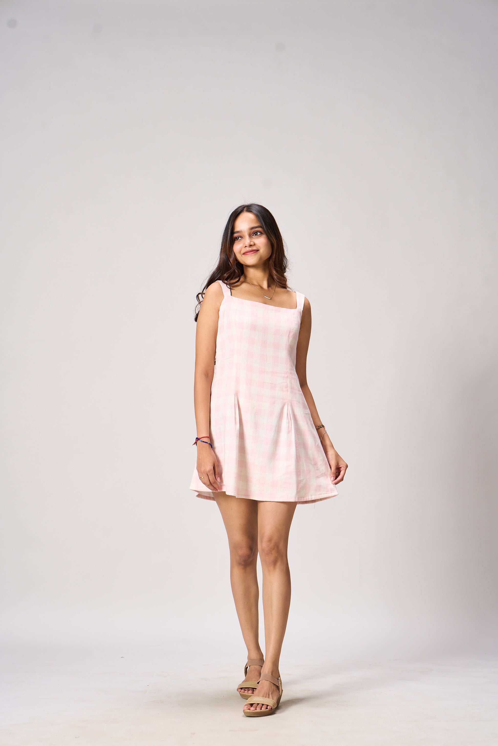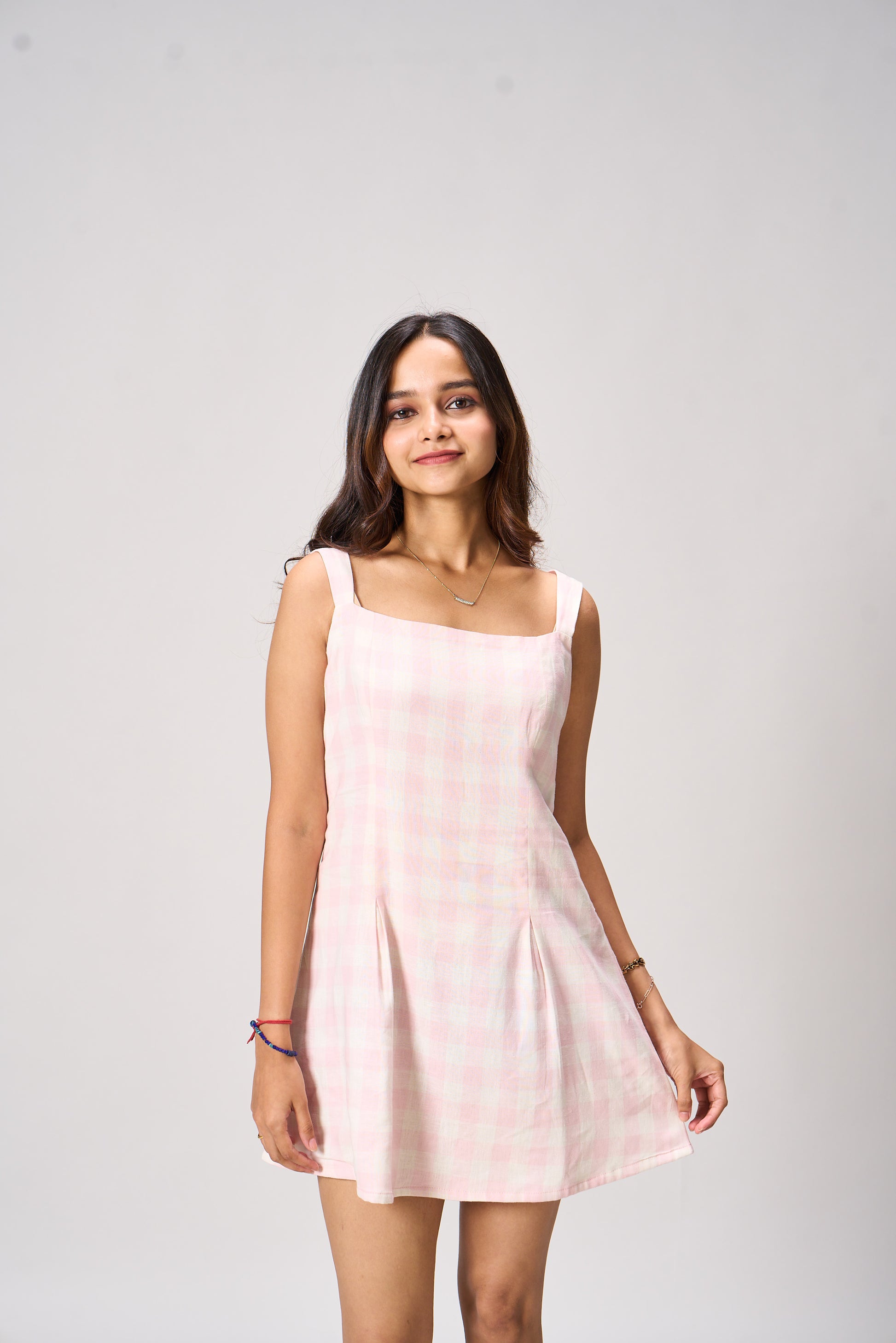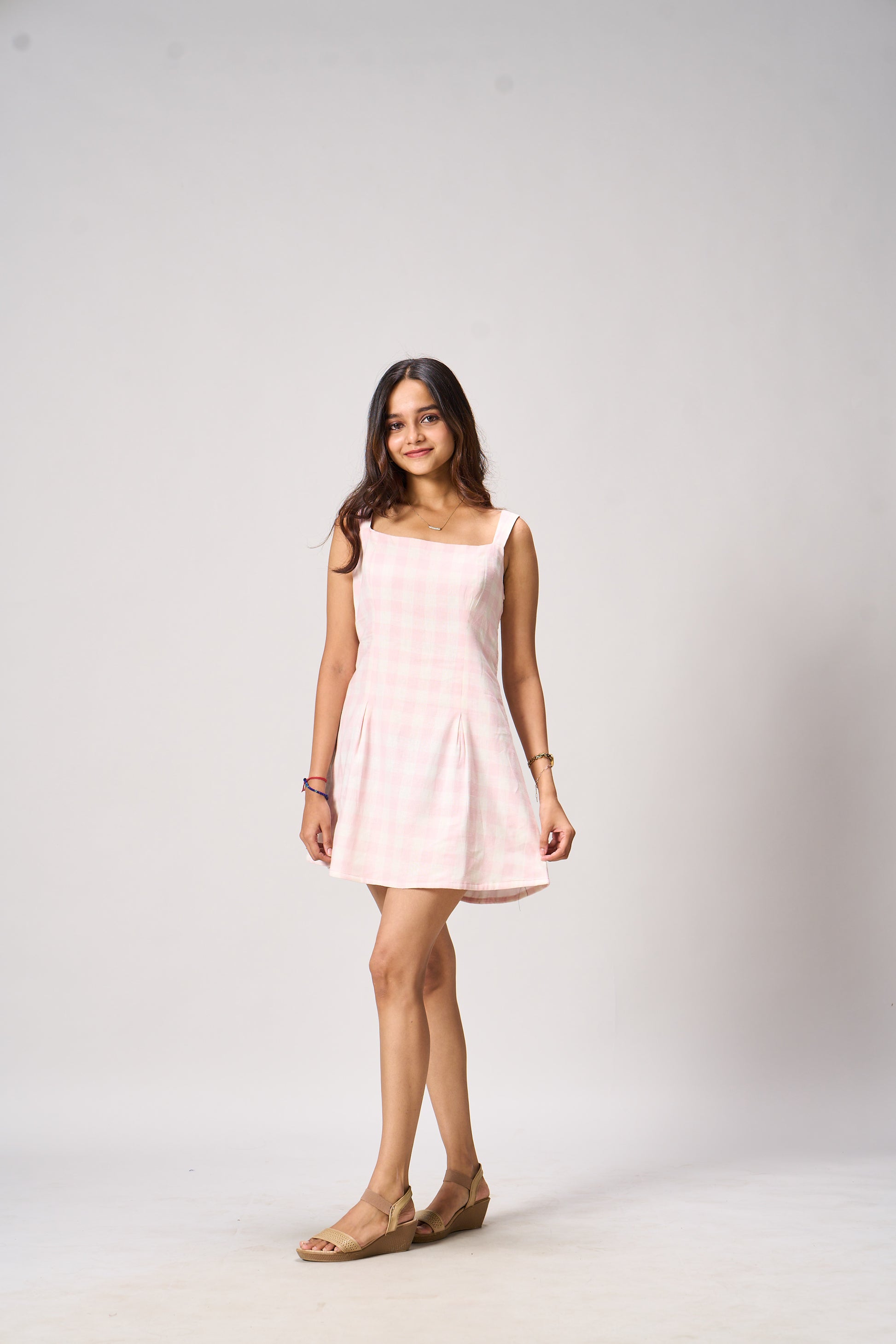 The Emma Sleeveless Mini Dress is designed with a flattering square neckline and a subtly flared A-line silhouette. Its tailored bodice hugs the figure while the structured pleats at the skirt add a playful swing. Perfect for picnics, brunches, and sunny strolls.
