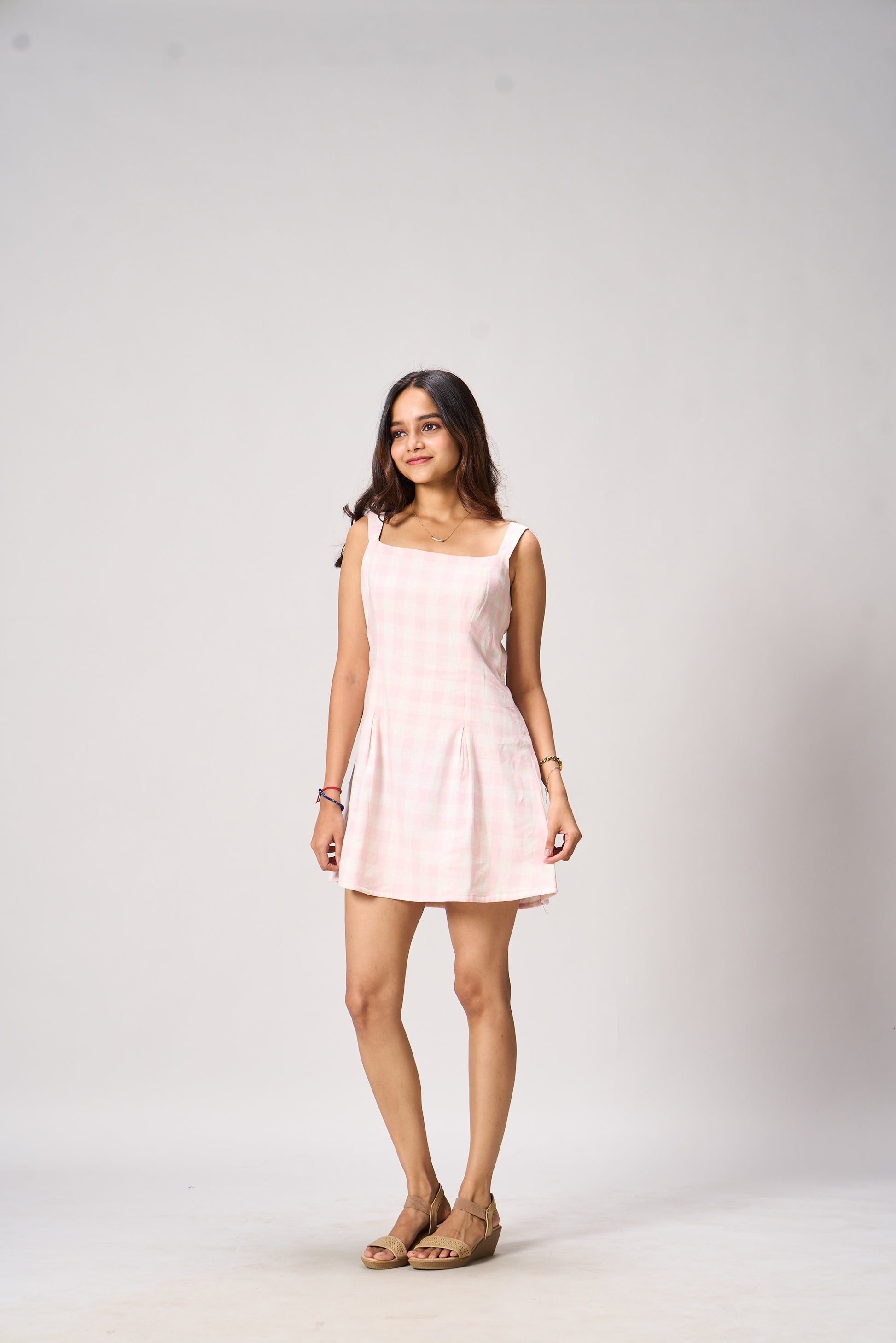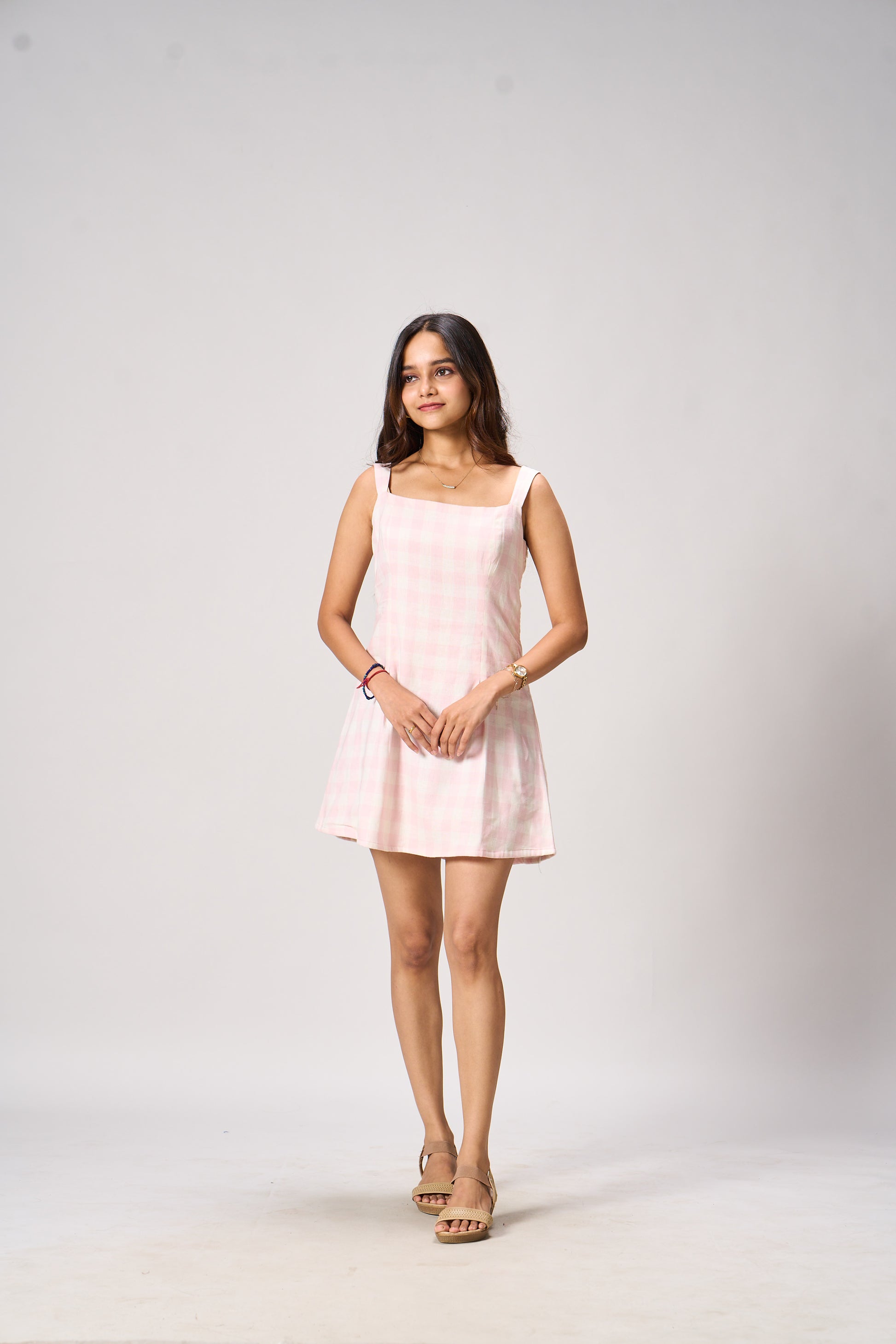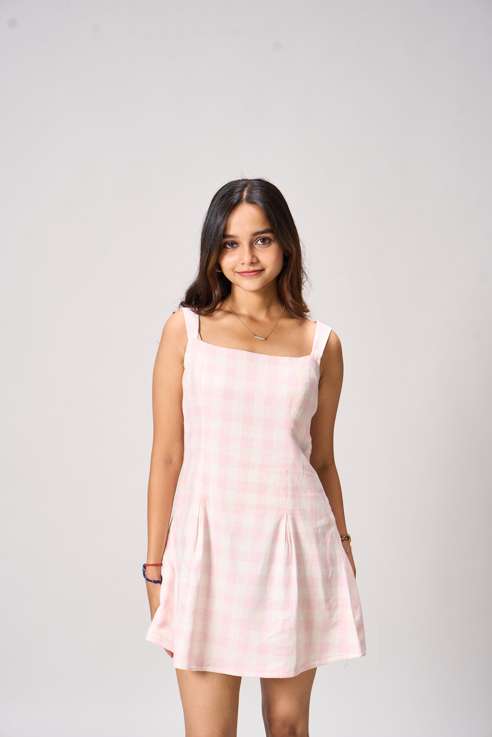 The Emma Sleeveless Mini Dress is designed with a flattering square neckline and a subtly flared A-line silhouette. Its tailored bodice hugs the figure while the structured pleats at the skirt add a playful swing. Perfect for picnics, brunches, and sunny strolls.