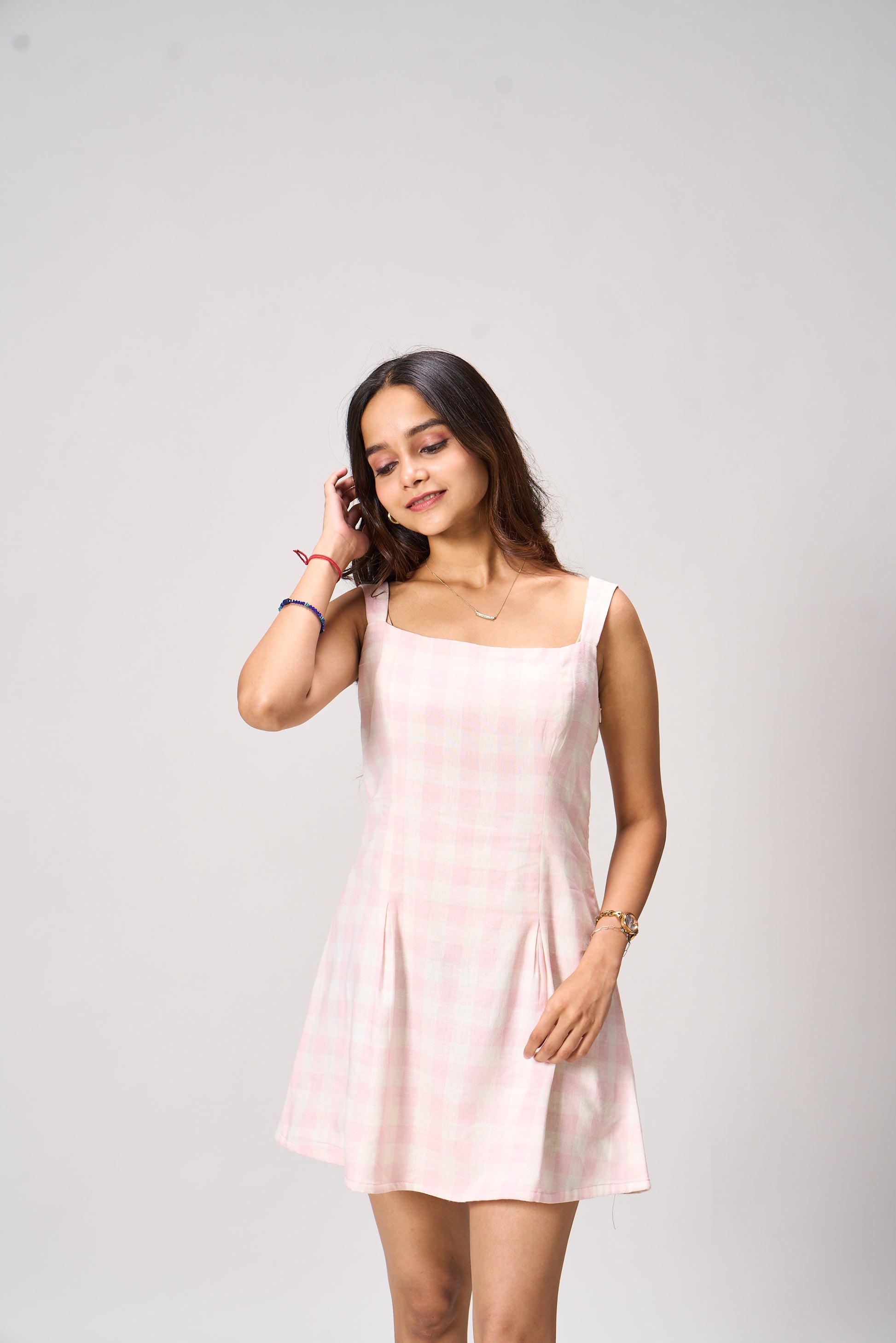 1. Color : Blush Pink & White 2. Fabric : Cotton 3. Details : Peplum Tube Style | Fitted Body | Relaxed Peplum | Checkered Pattern