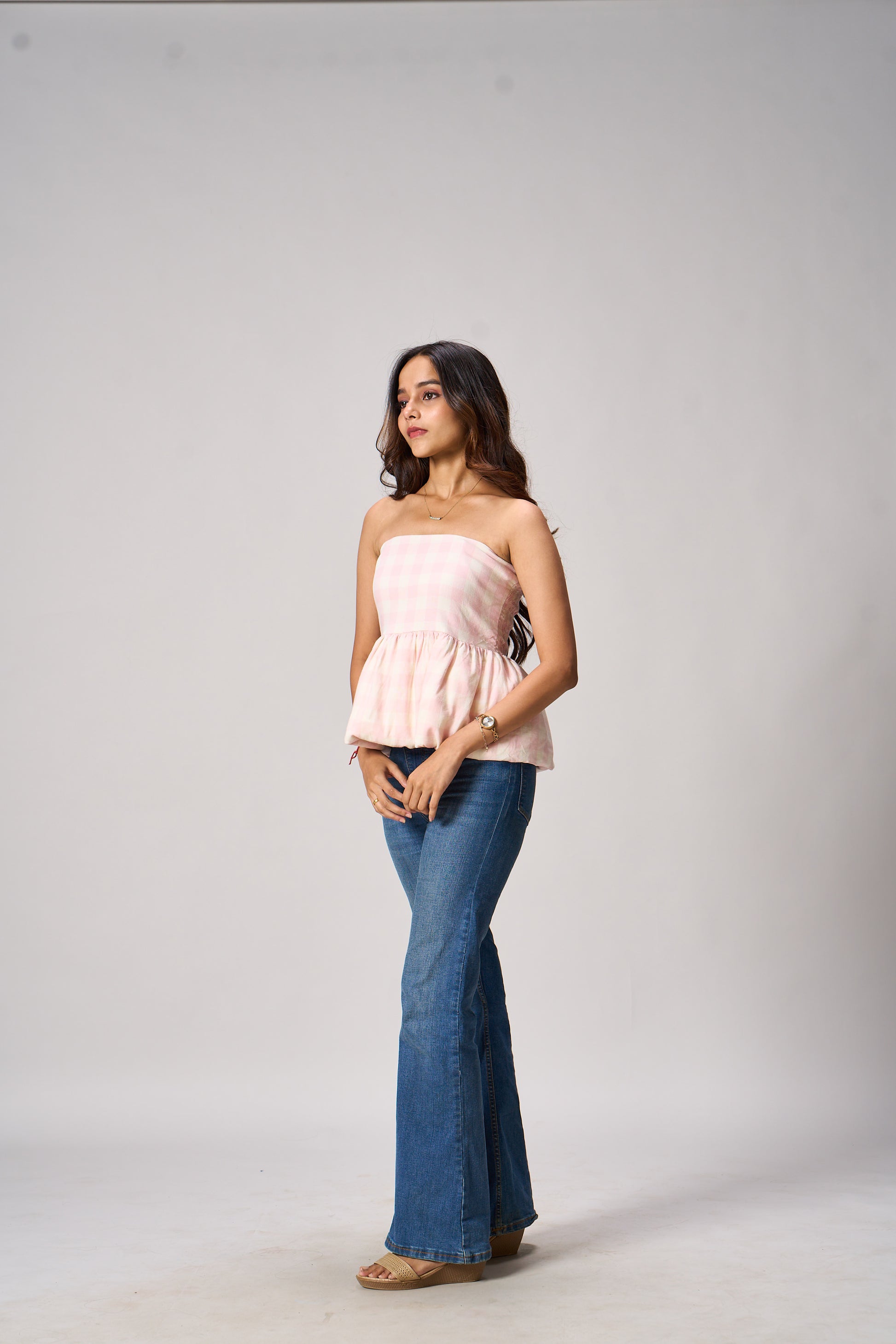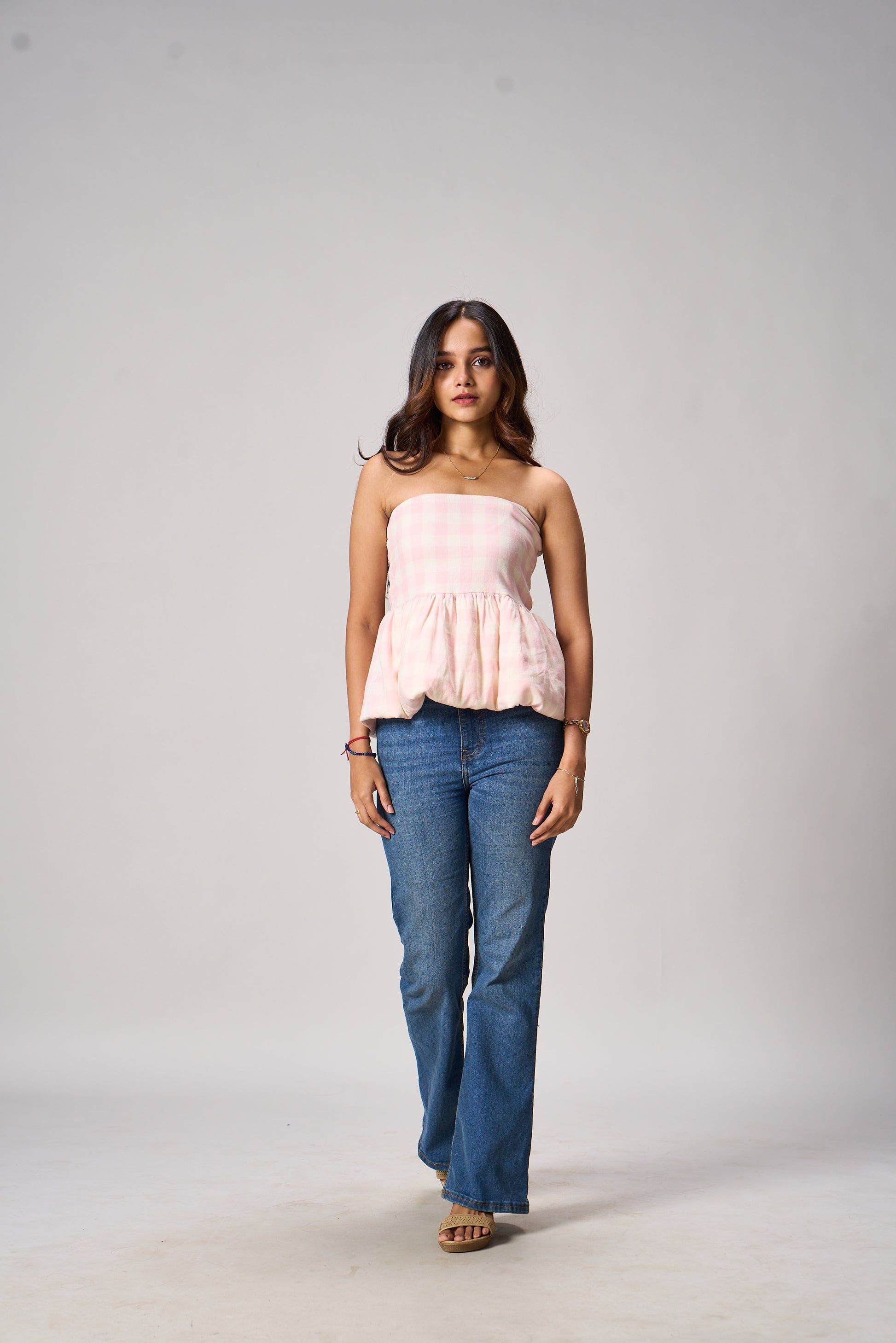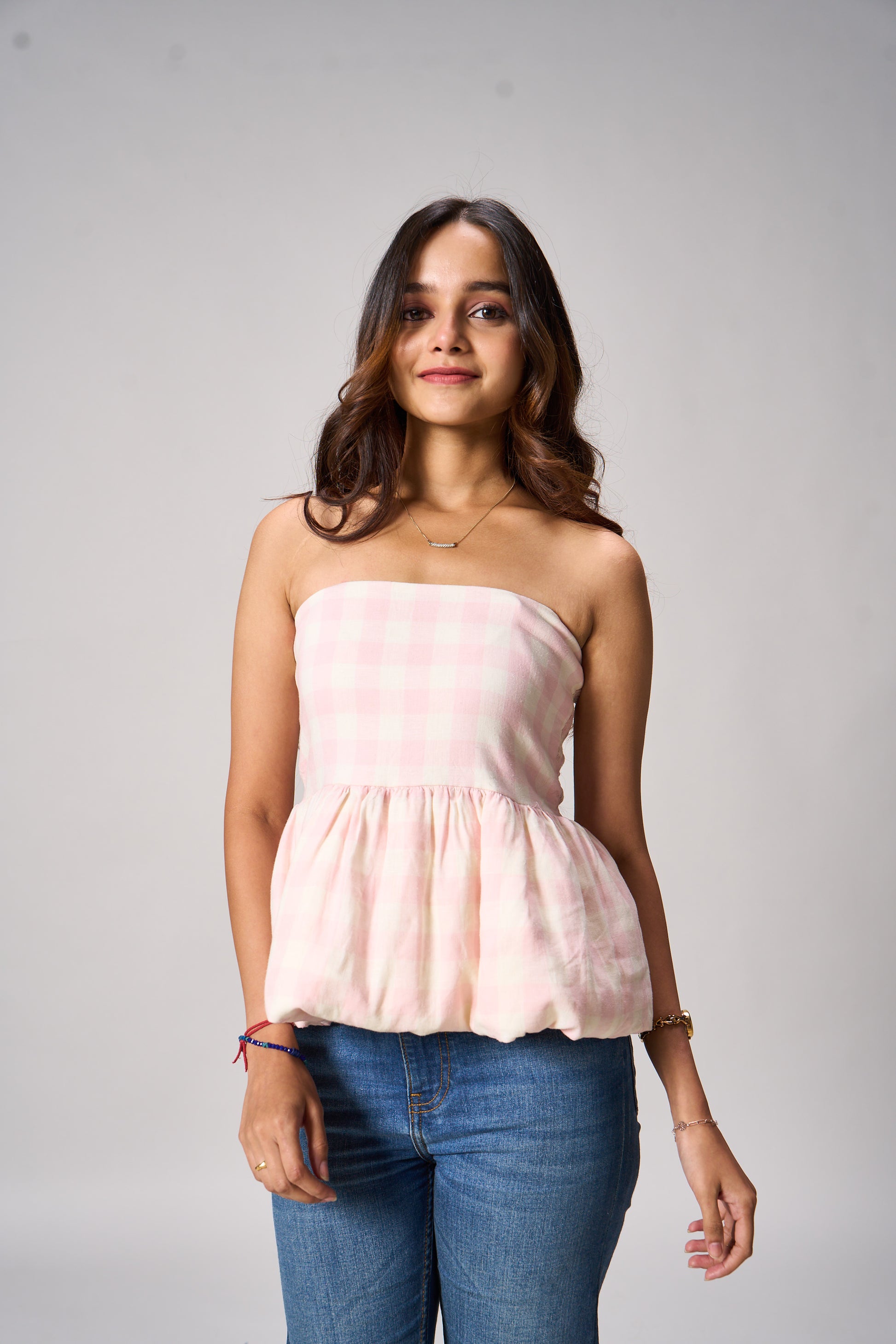 1. Color : Blush Pink & White 2. Fabric : Cotton 3. Details : Peplum Tube Style | Fitted Body | Relaxed Peplum | Checkered Pattern