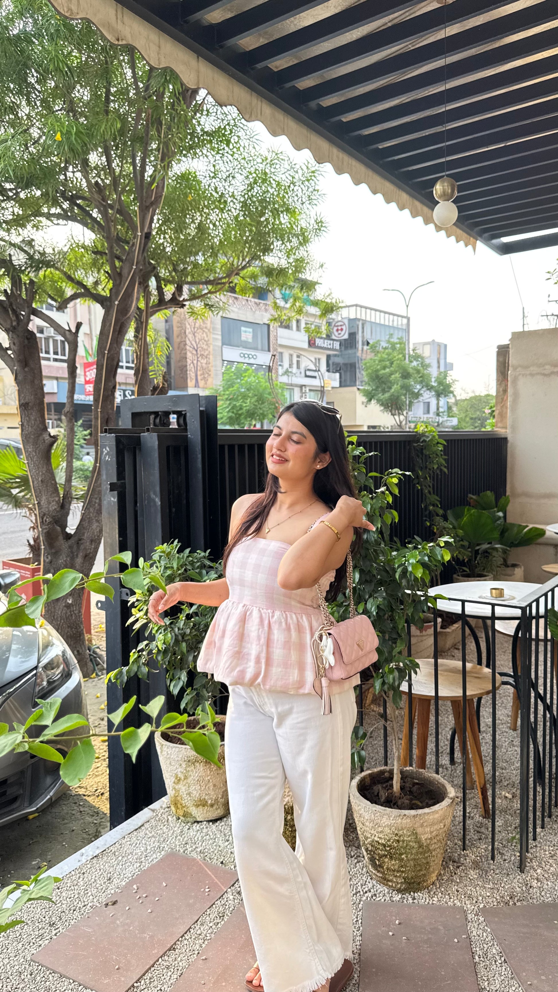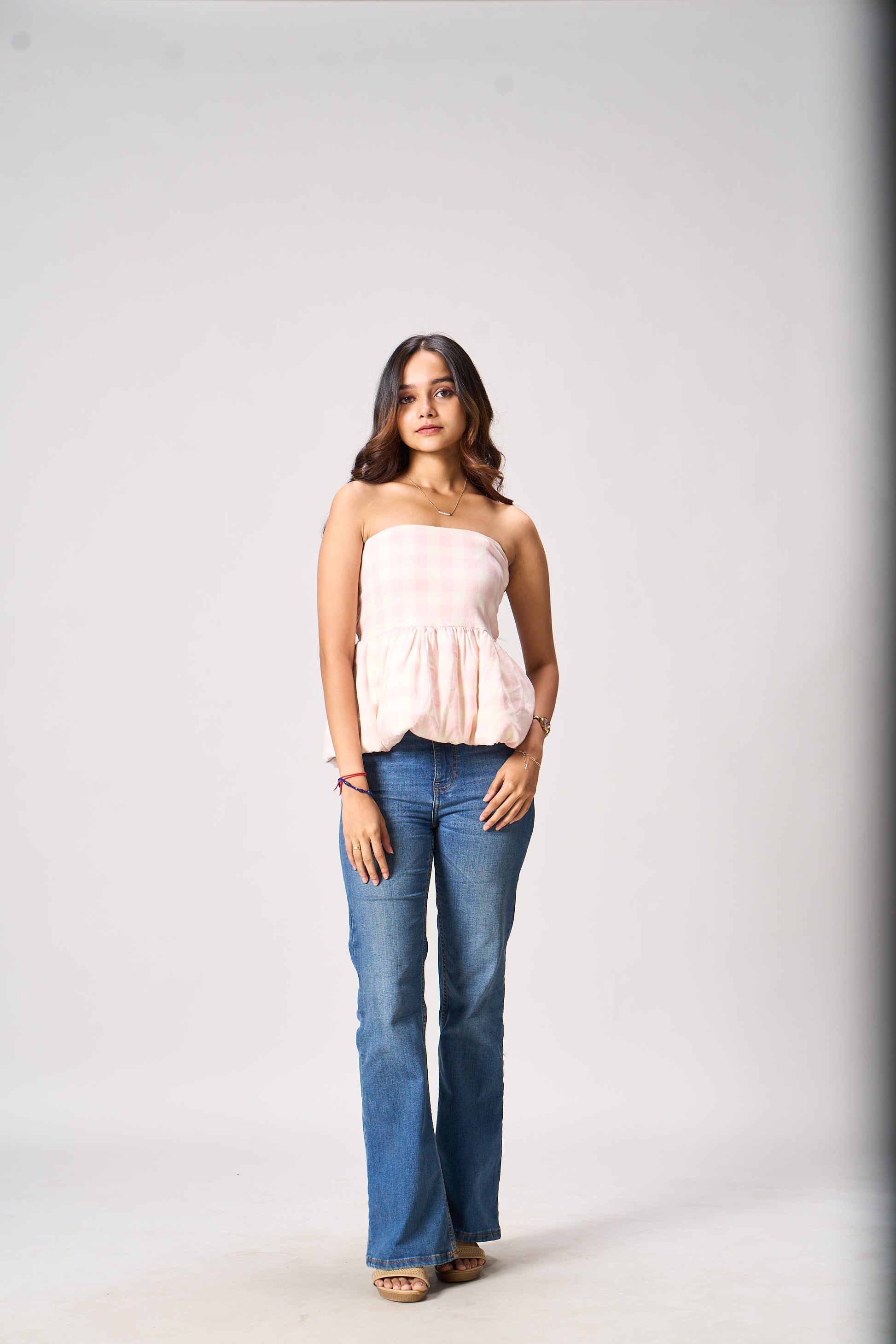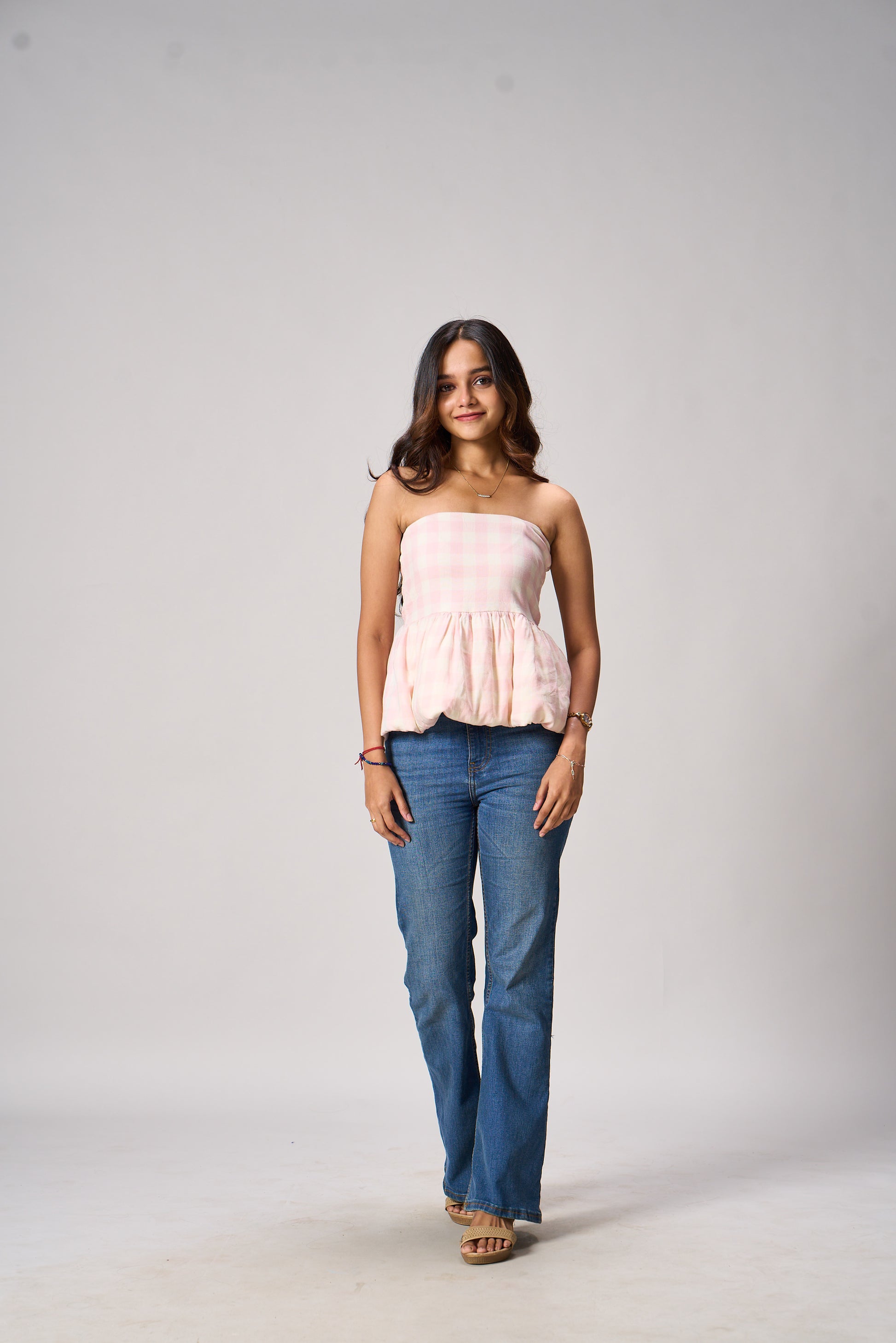 1. Color : Blush Pink & White 2. Fabric : Cotton 3. Details : Peplum Tube Style | Fitted Body | Relaxed Peplum | Checkered Pattern