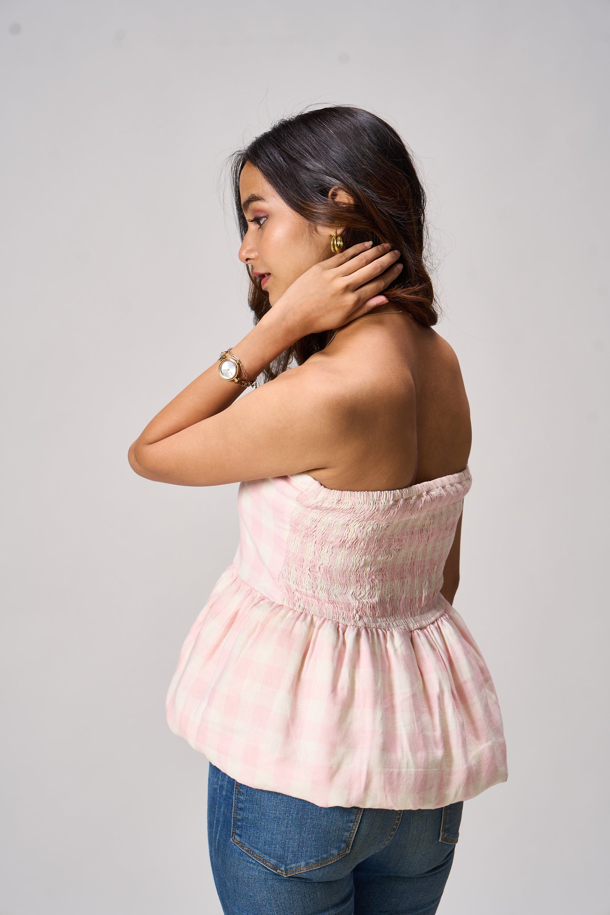 The Emma Peplum tube top adds a sweet and playful touch to your wardrobe This strapless piece features a charming pink and white checkered pattern and a flattering peplum silhouette that cinches at the waist and flares out for a feminine finish. Designed for summer brunches, vacations, and casual daywear.