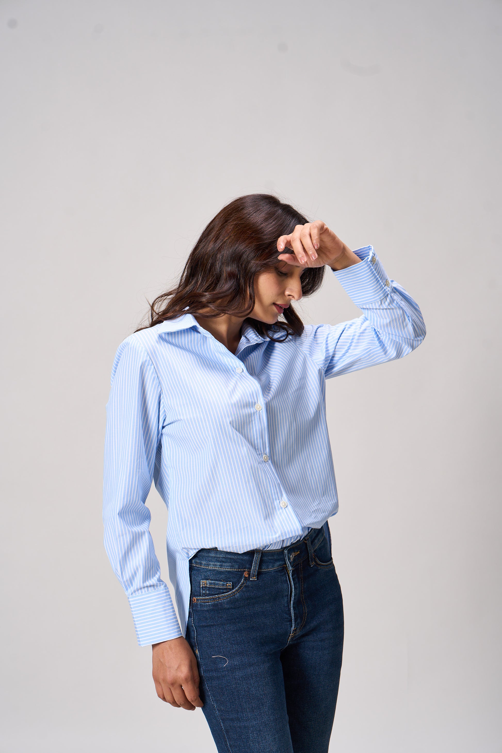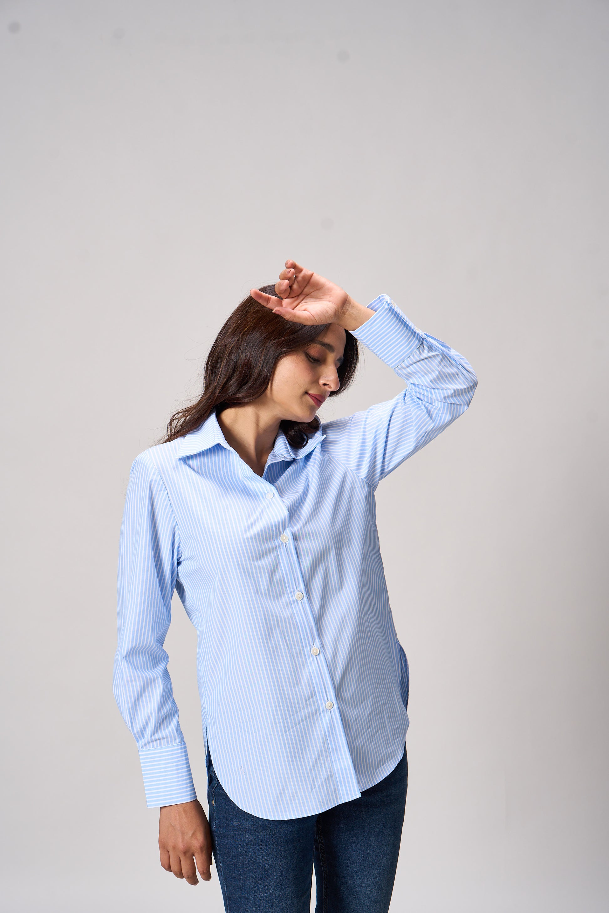 The Lola Classic Blue Pinstripe Button-Down Shirt is a timeless staple with a modern edge. Featuring a crisp collar, full sleeves, and a tailored silhouette, this button-down shirt is adorned with subtle vertical white pinstripes on a soft blue base. Perfect for workdays, weekend outings, or layering under a blazer, it combines comfort with polished style.