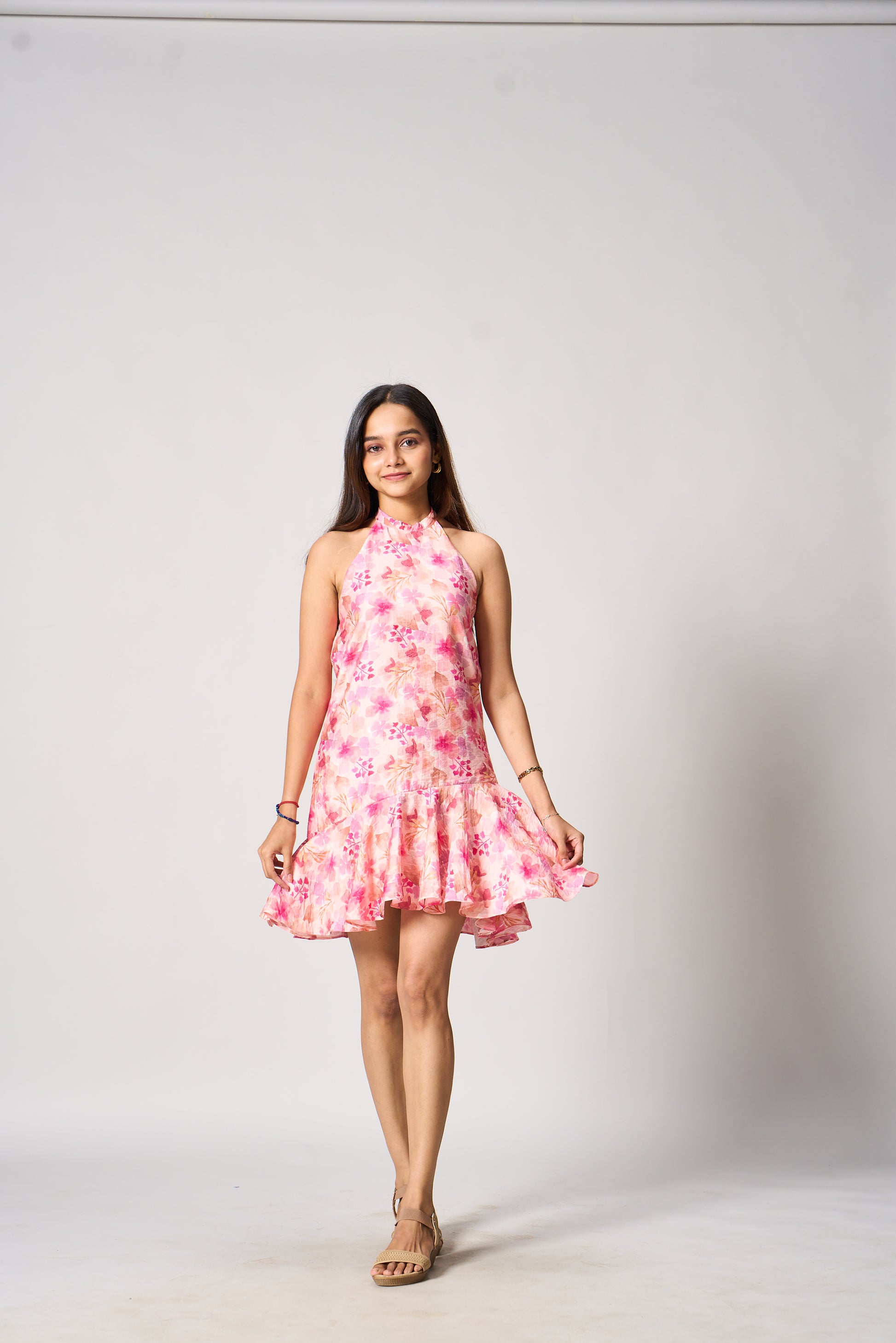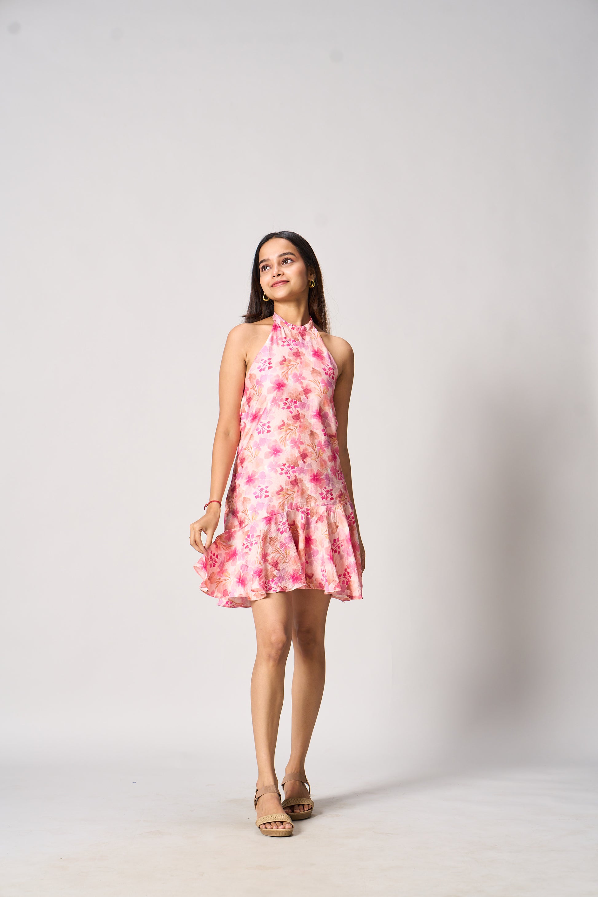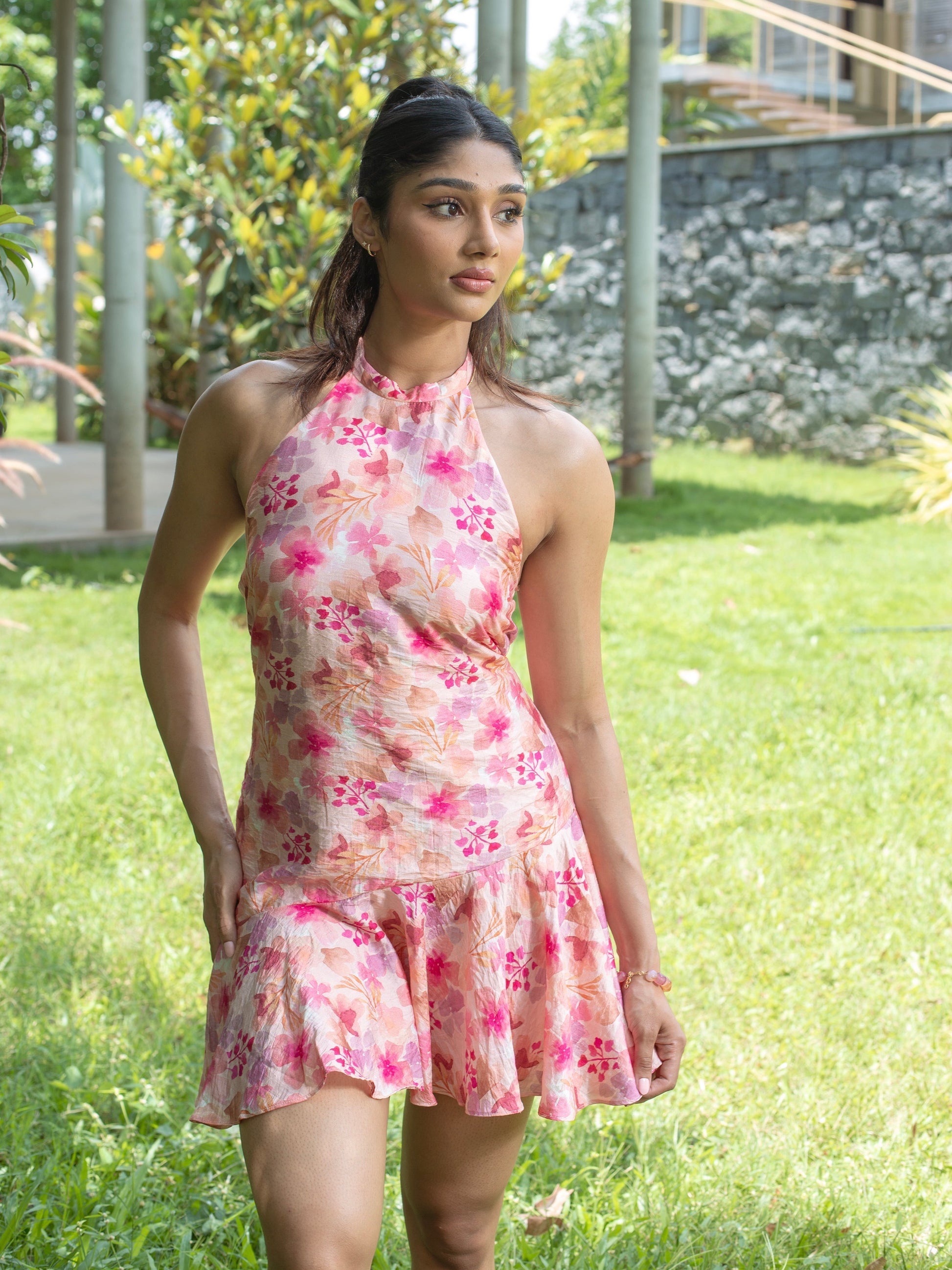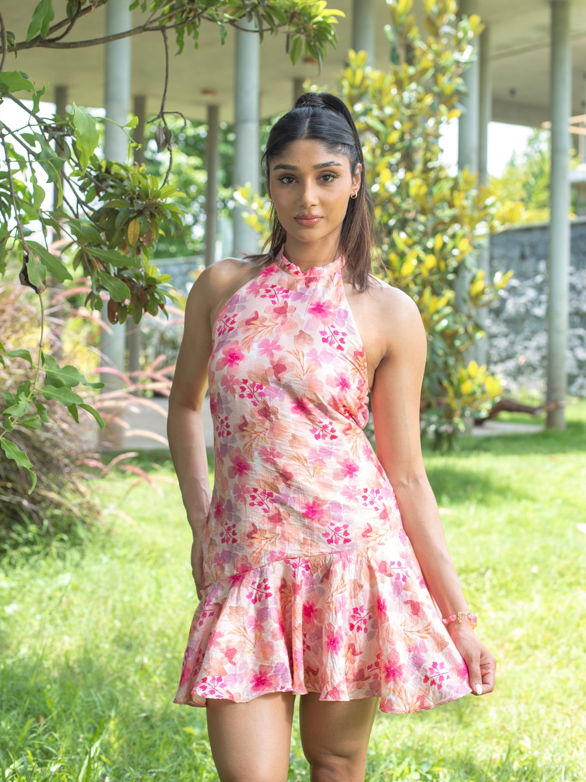 3- Detail: Mini Length | Ruffled Dress | Floral Print | Halter neckline
