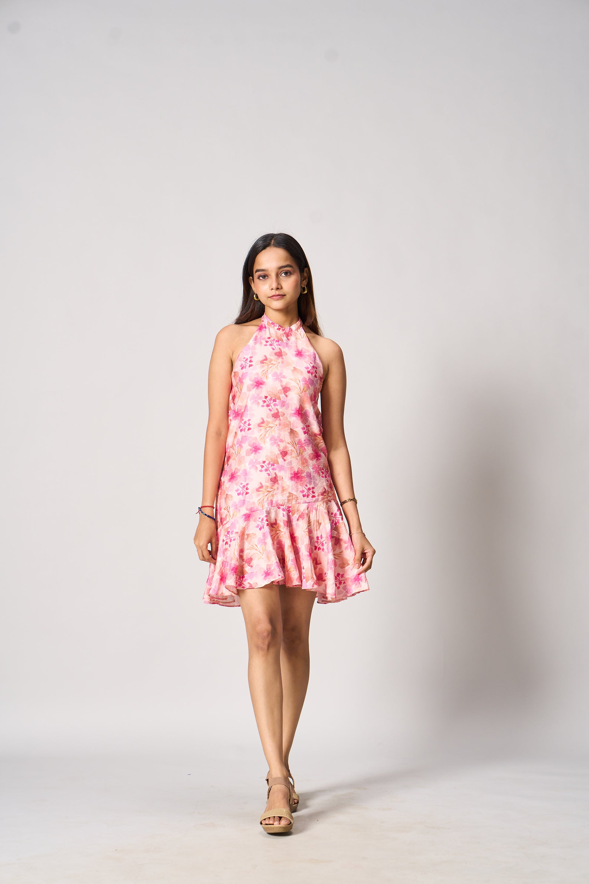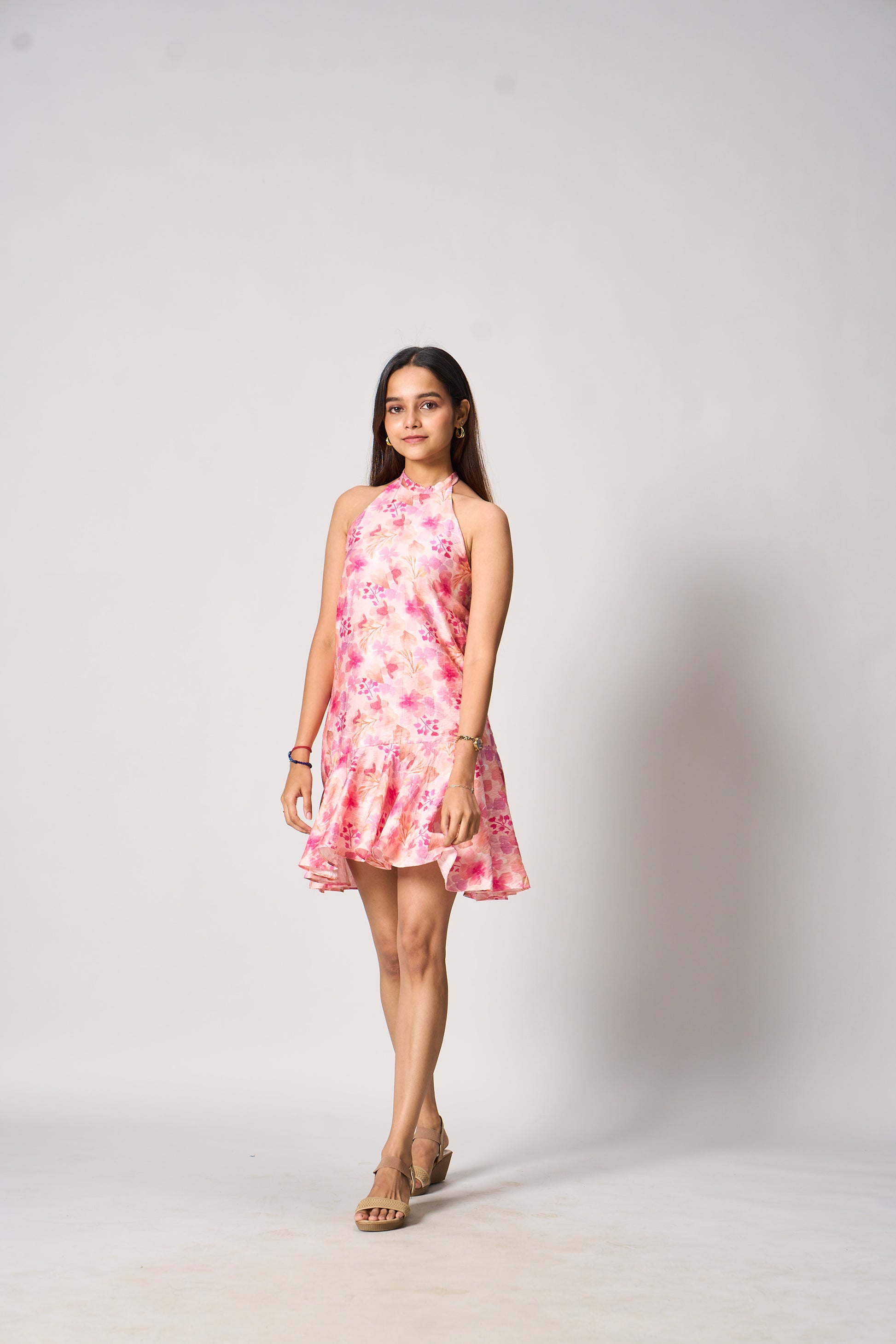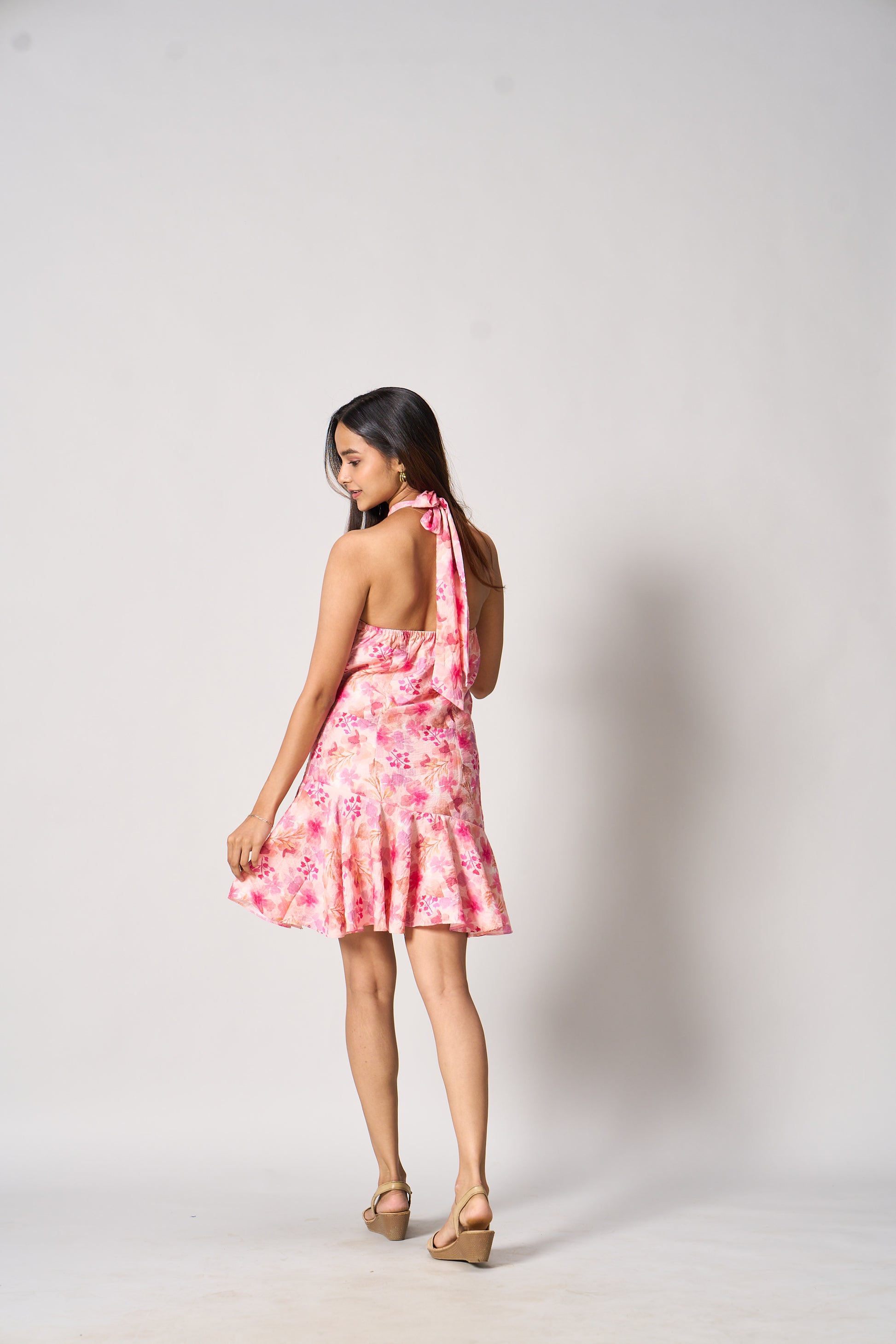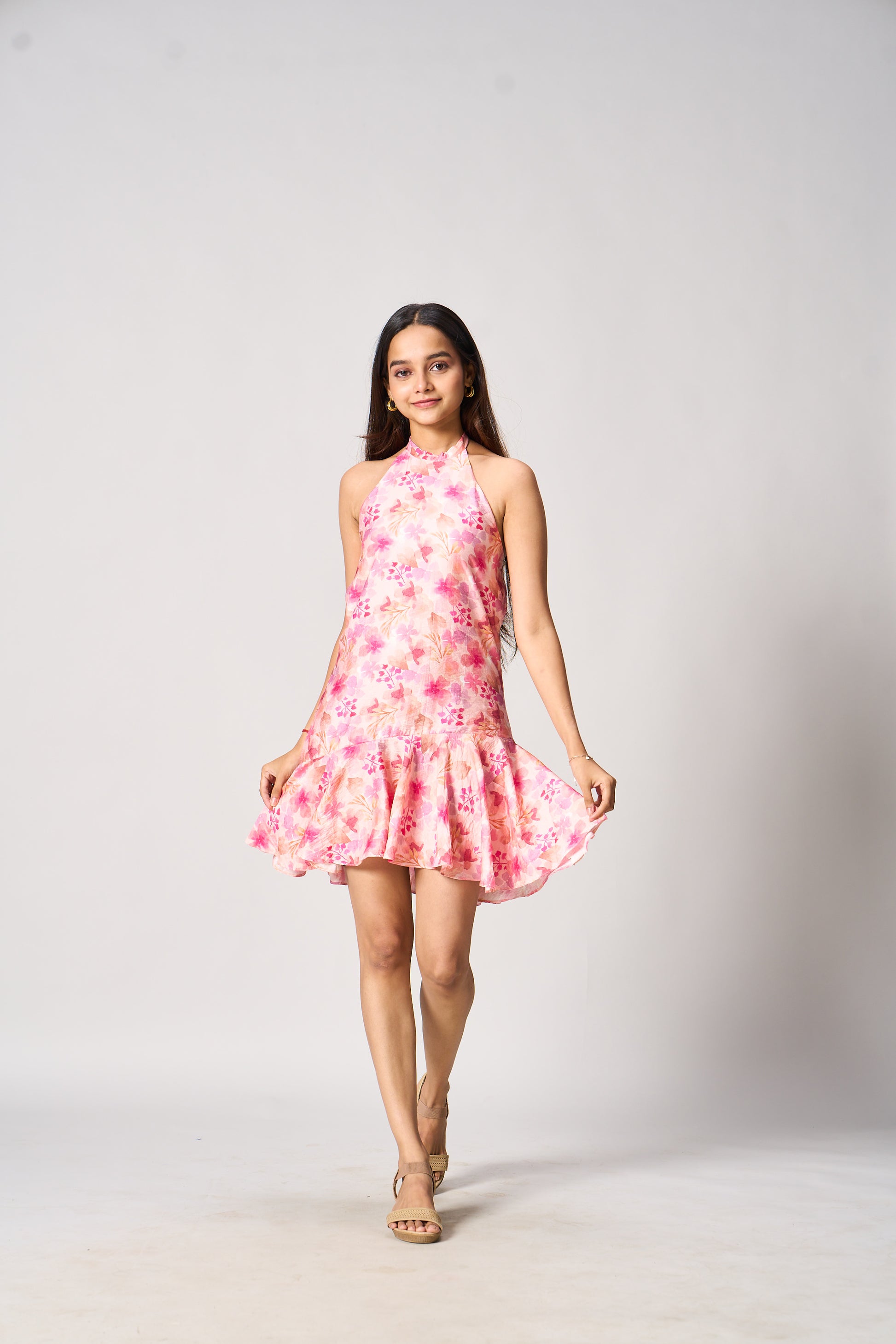 3- Detail: Mini Length | Ruffled Dress | Floral Print | Halter neckline