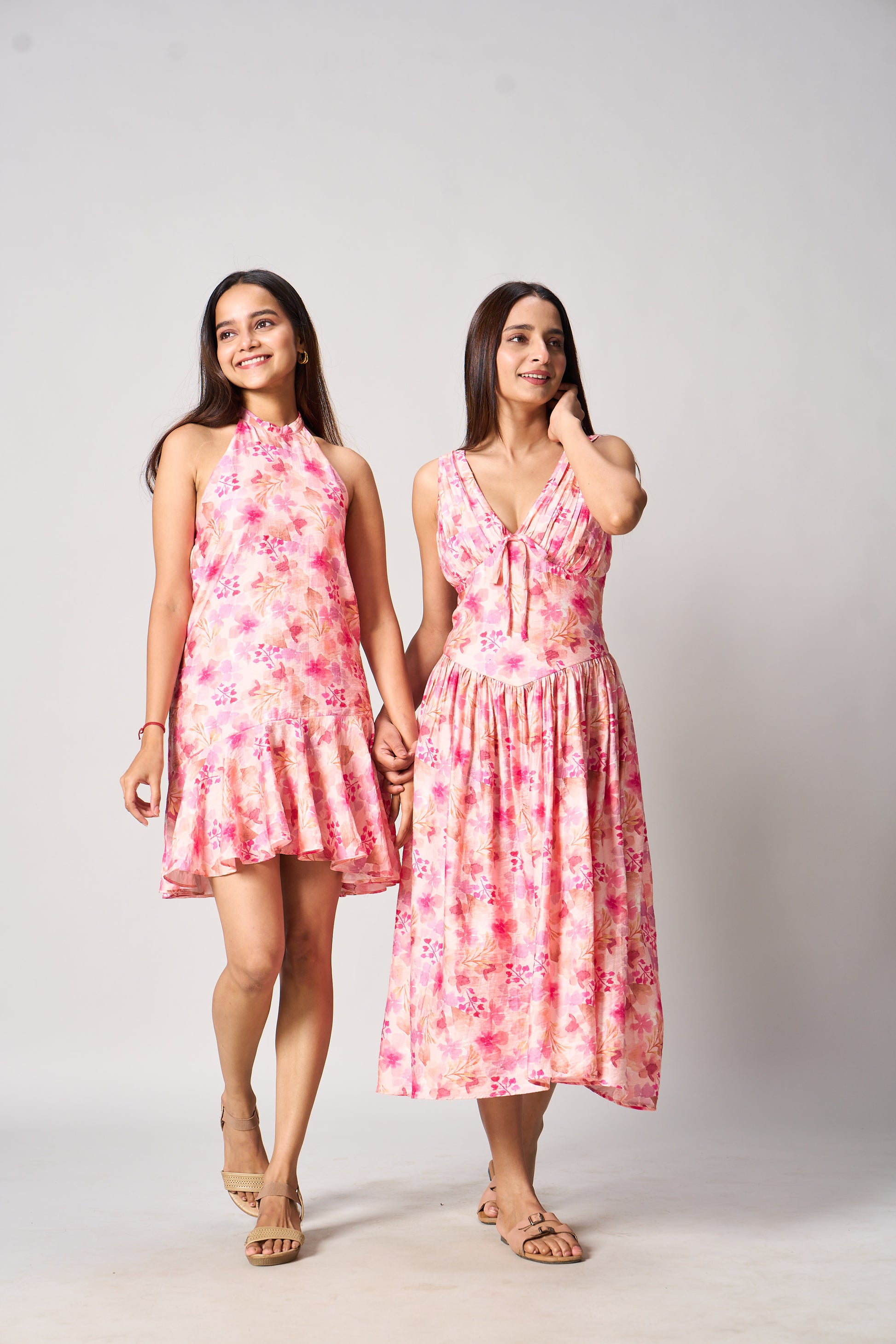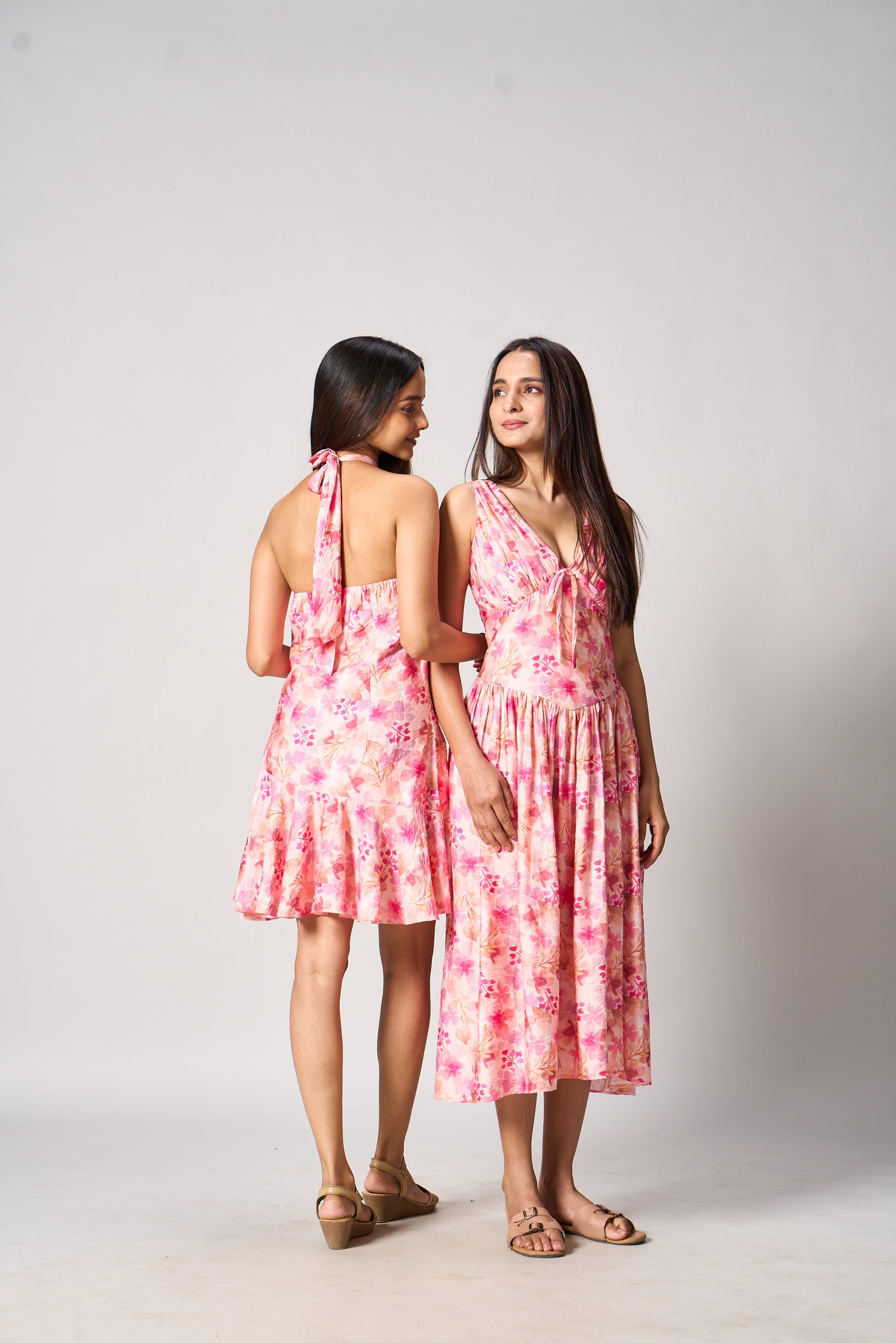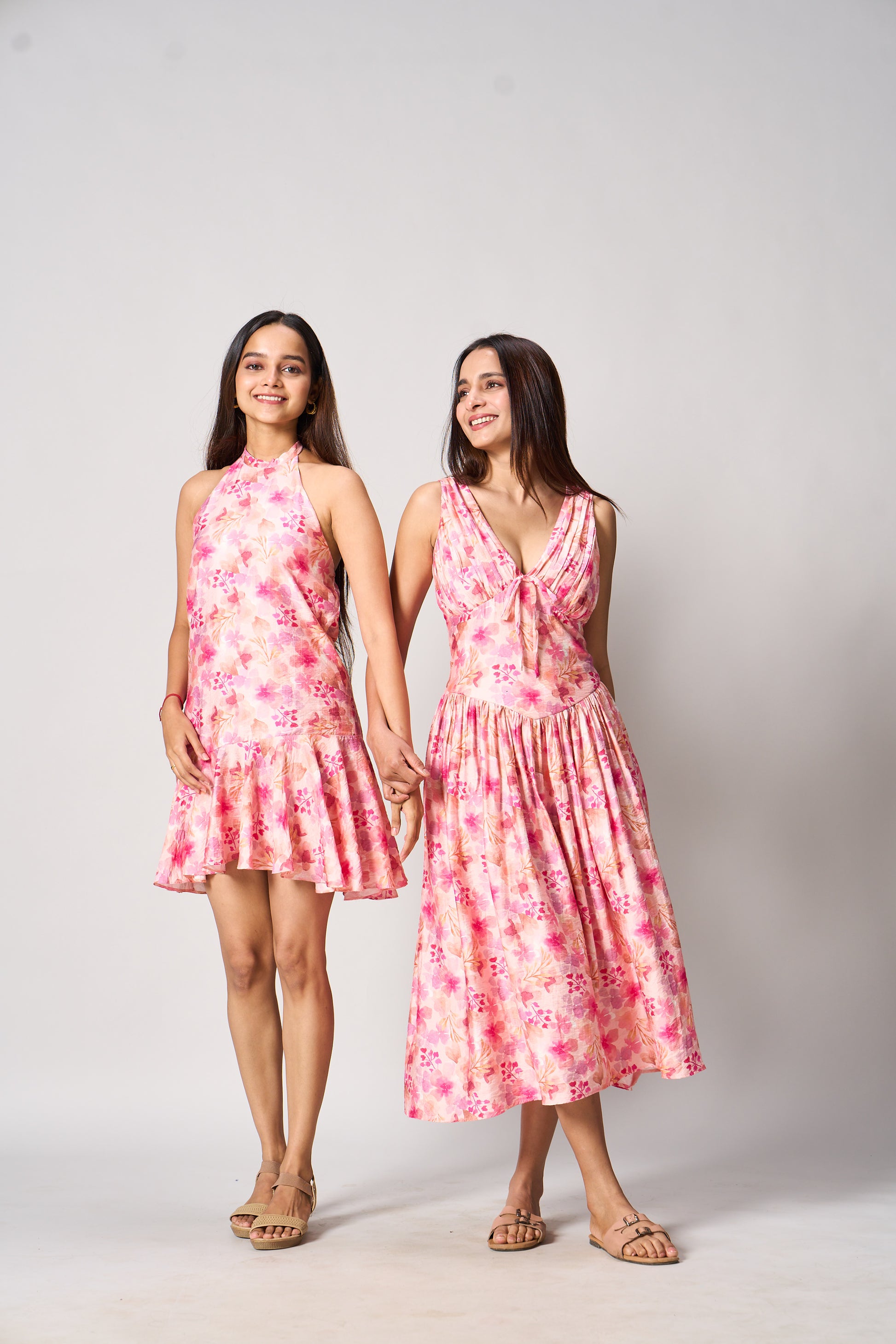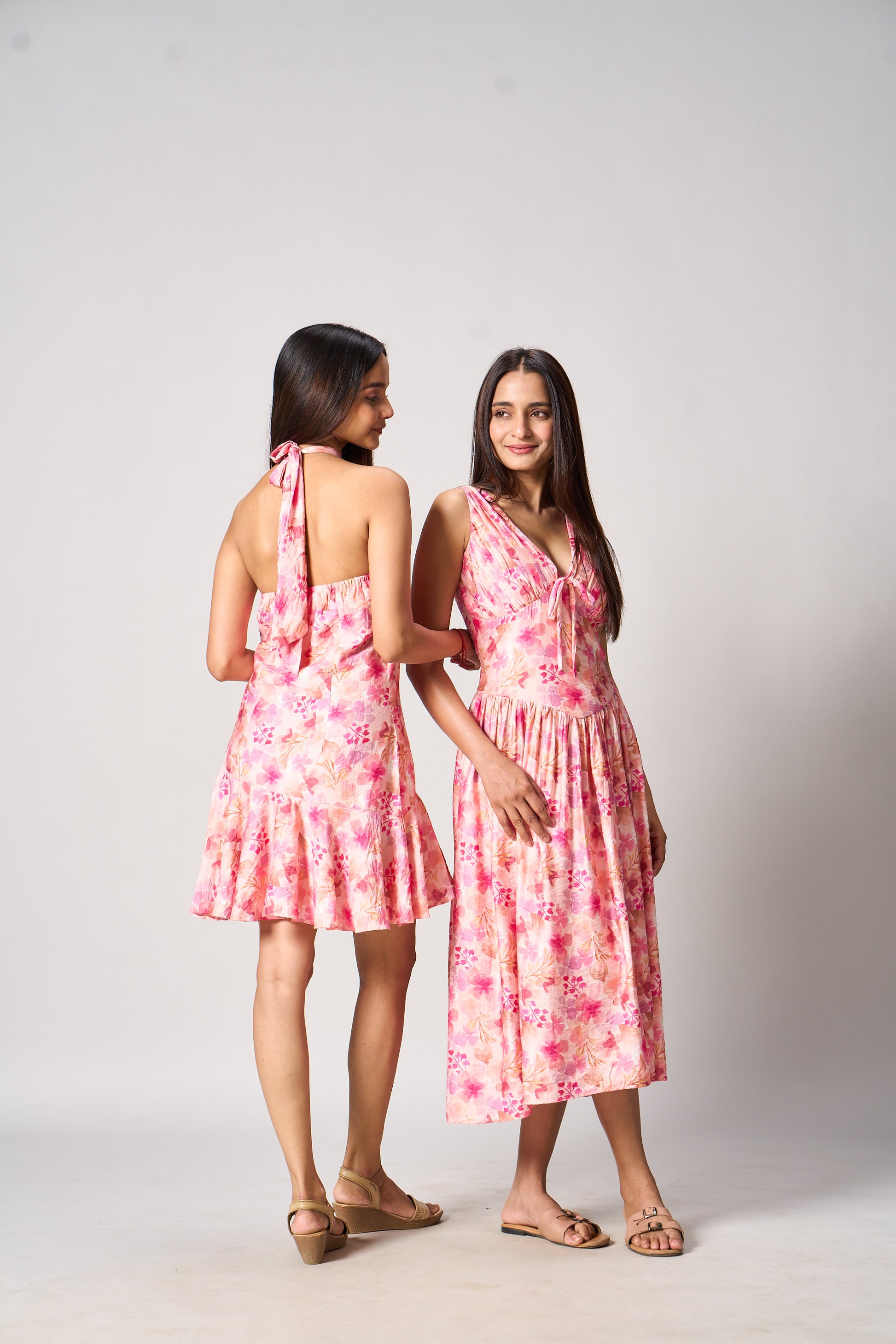 3- Detail: Mini Length | Ruffled Dress | Floral Print | Halter neckline
