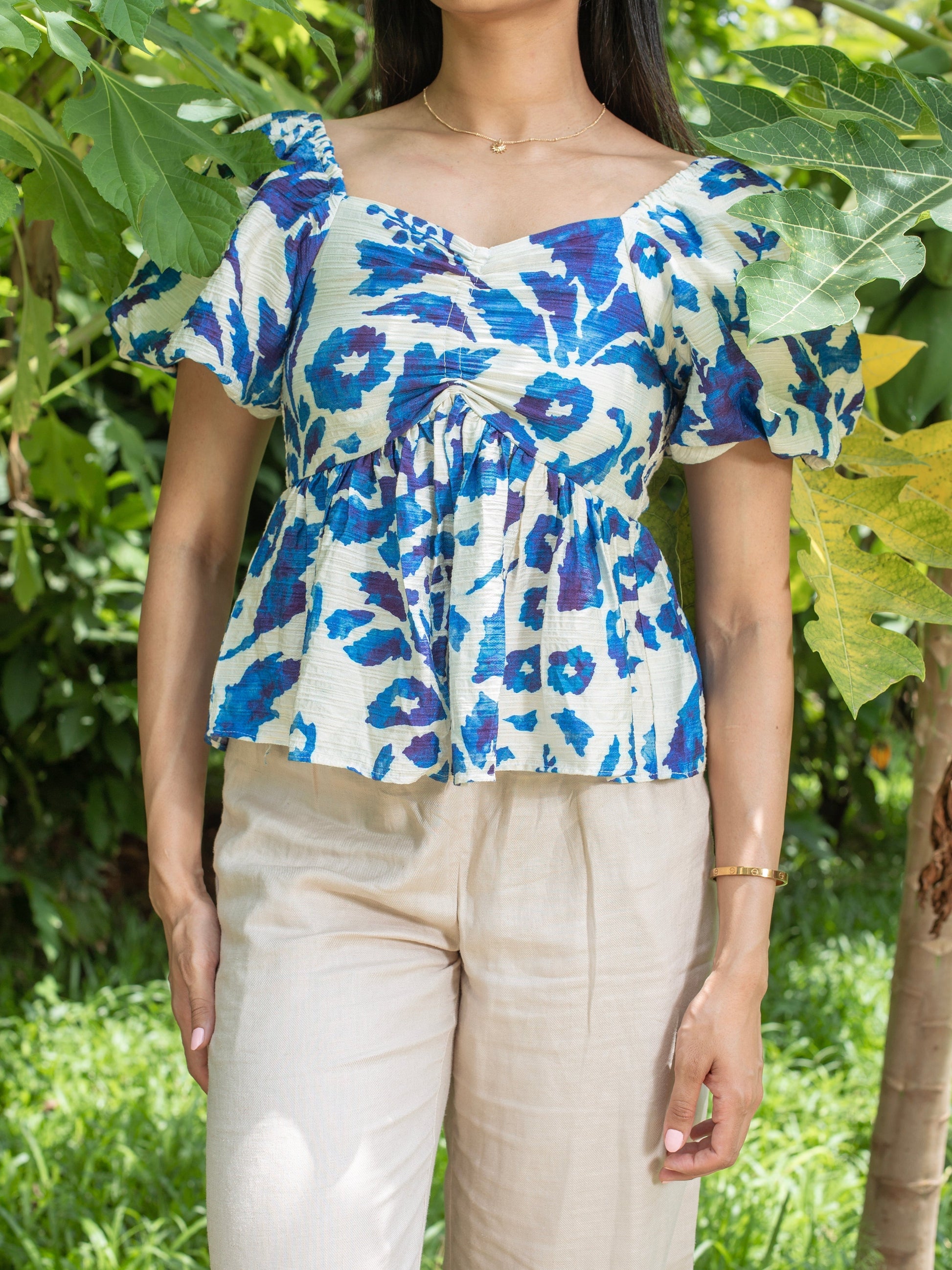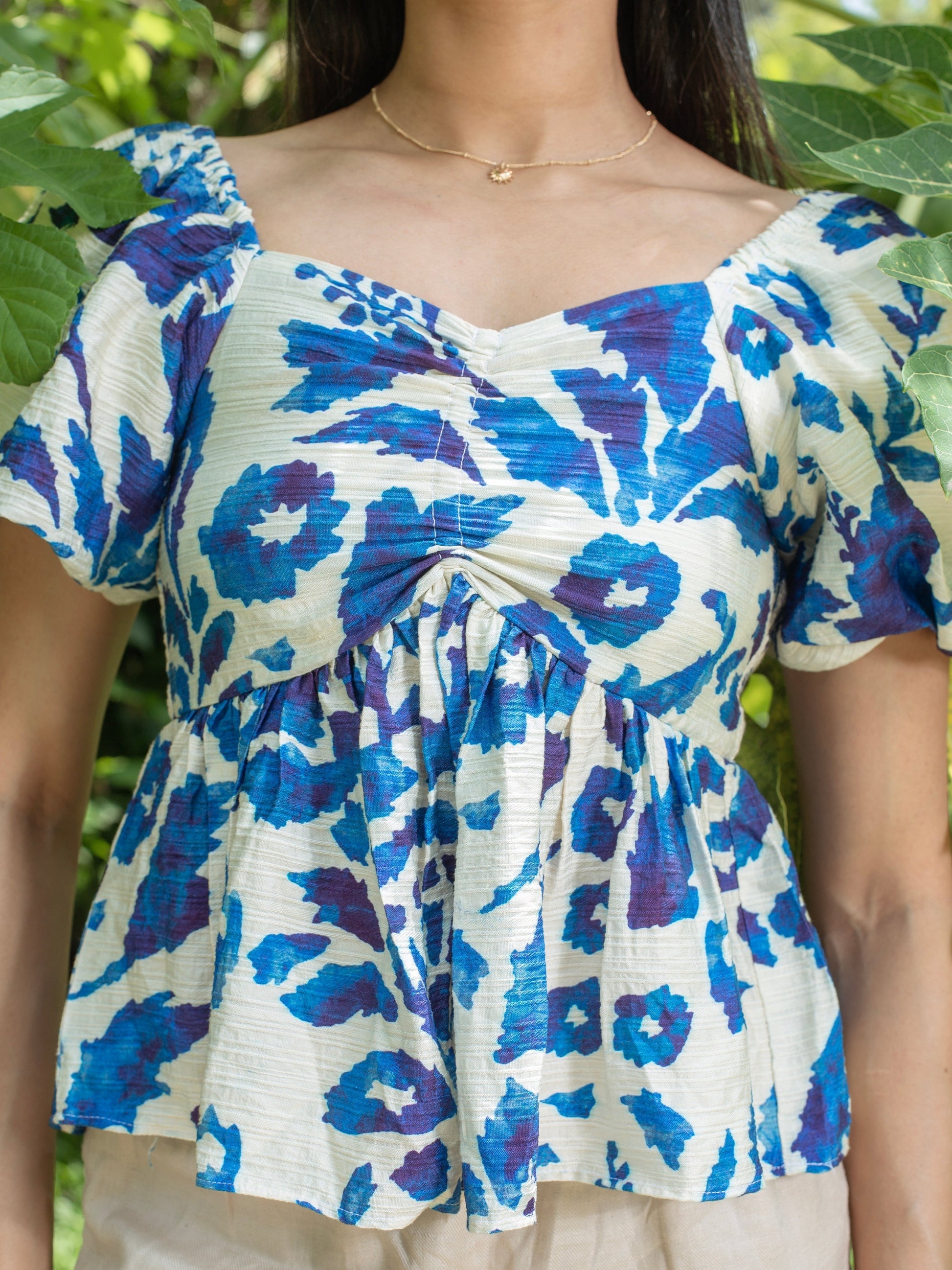 1. Color : White & Blue 2. Fabric : Rayon 3. Details : Sweetheart Neckline | Puffed Sleeve | Cropped Length | Bold Abstract Print | Peplum Stlye