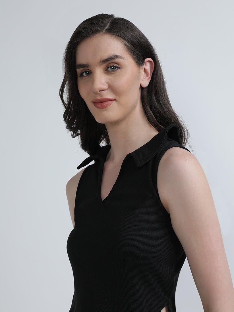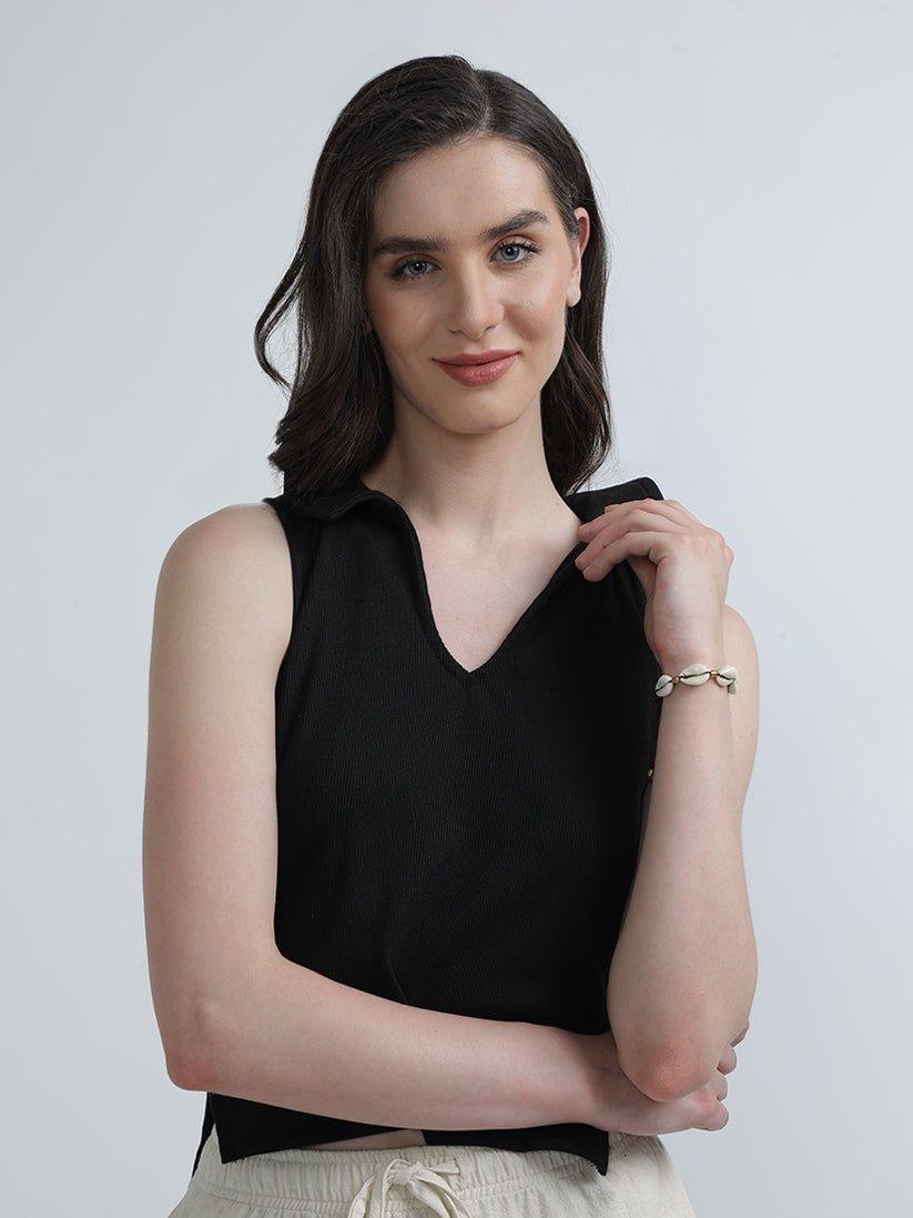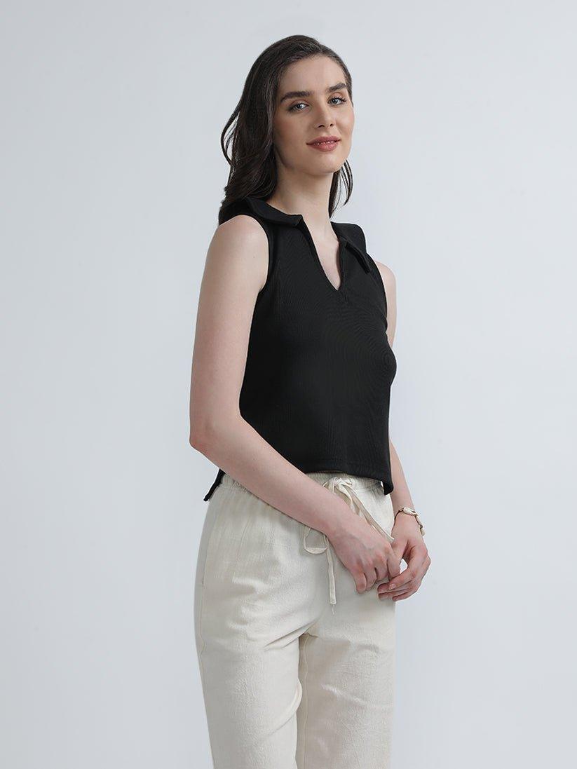 The Robin Ribbed Knit Top is a stylish and comfortable piece in a classic black color. Crafted from a soft and stretchy ribbed knit fabric, this sleeveless top features a collar for a touch of sophistication.