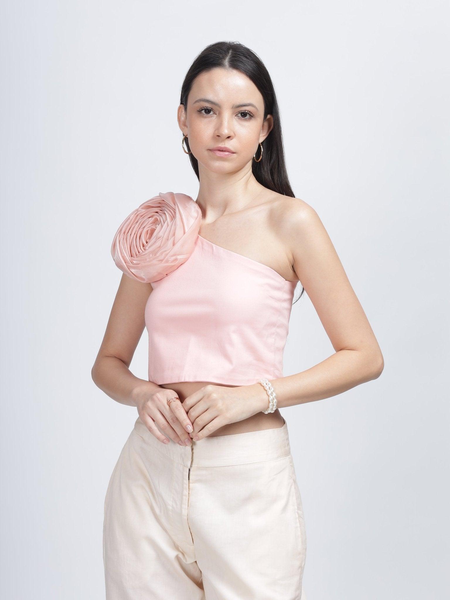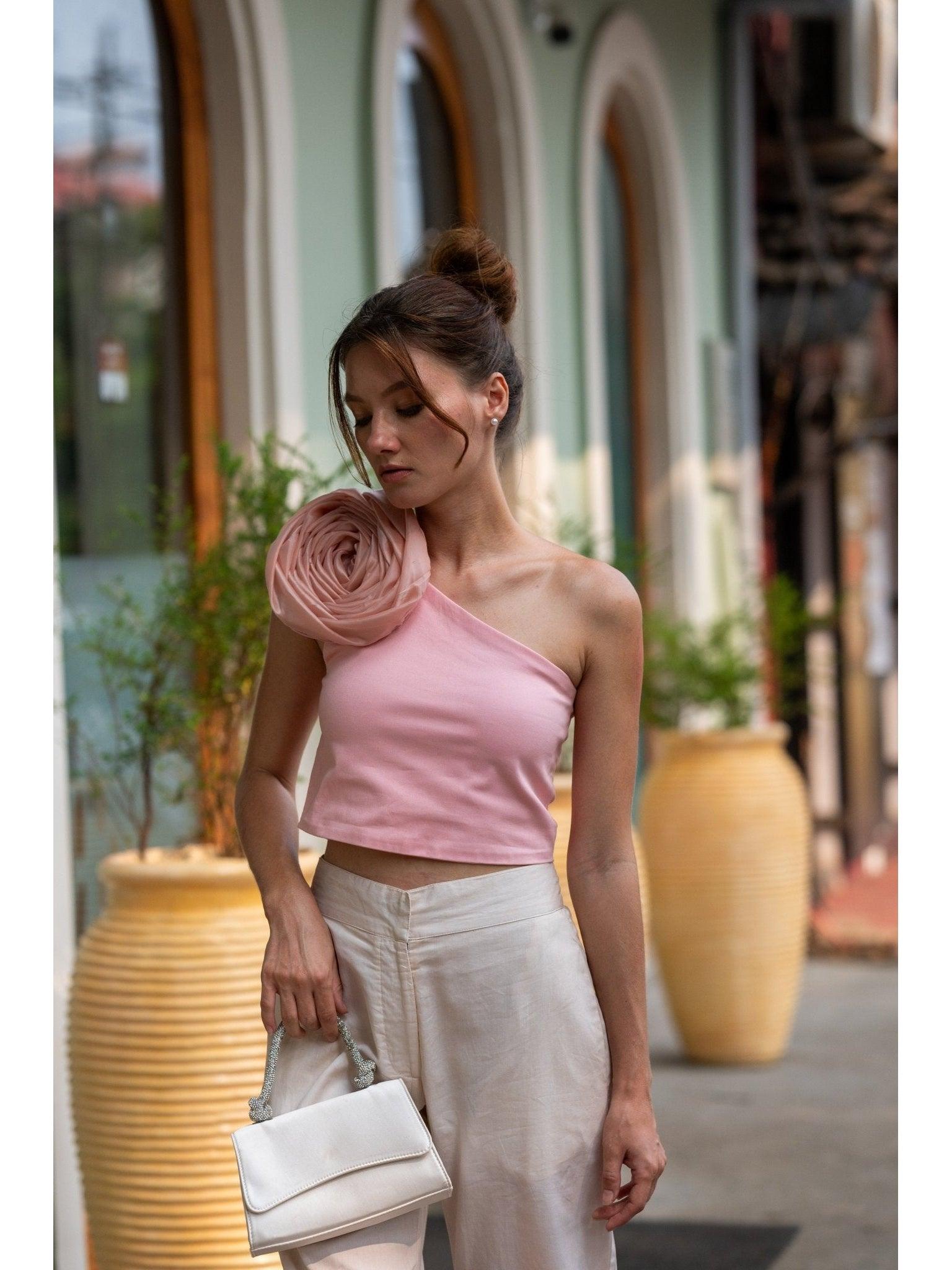 The Rosey Top is a stylish and versatile piece that offers a unique one-shoulder design. Crafted from stretchy cotton in a soft peach hue, this top features a detachable organza rose for a touch of feminine elegance.
