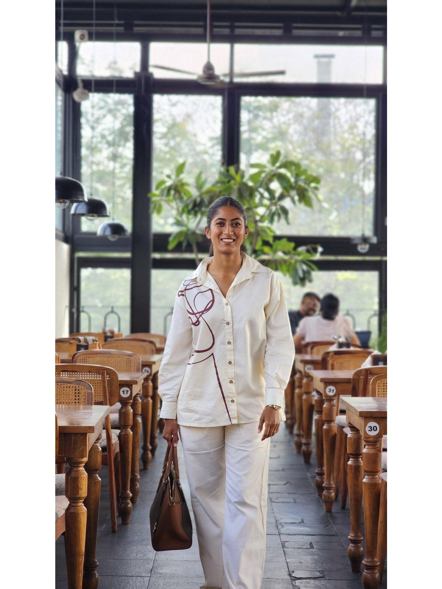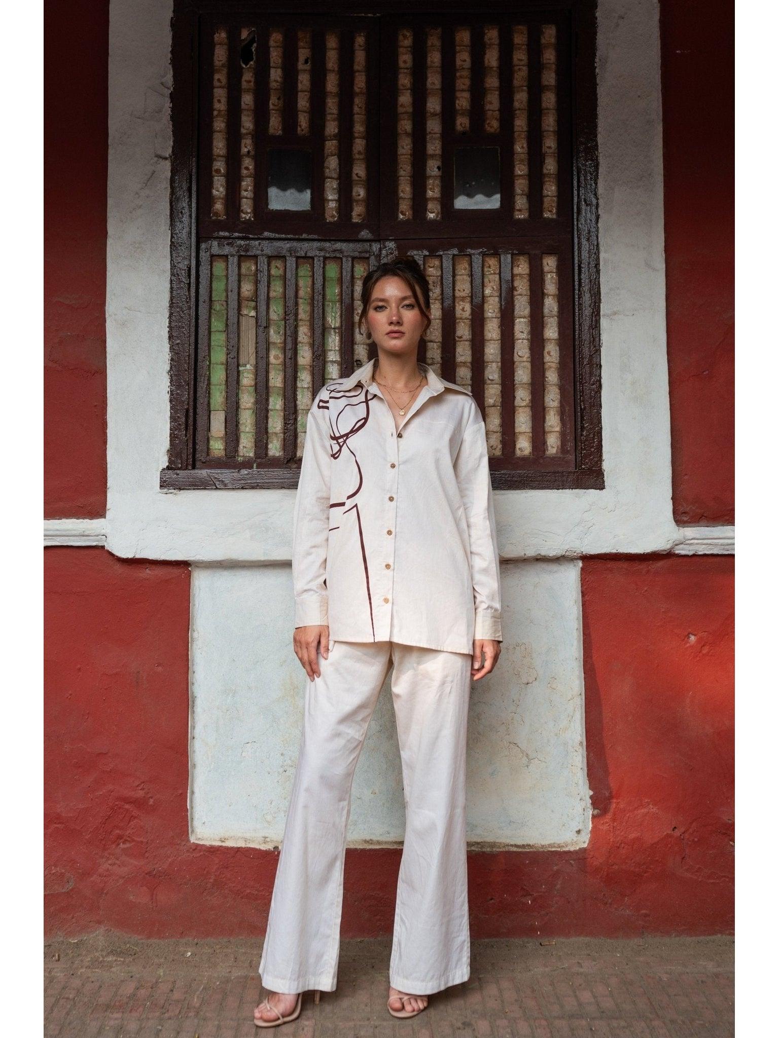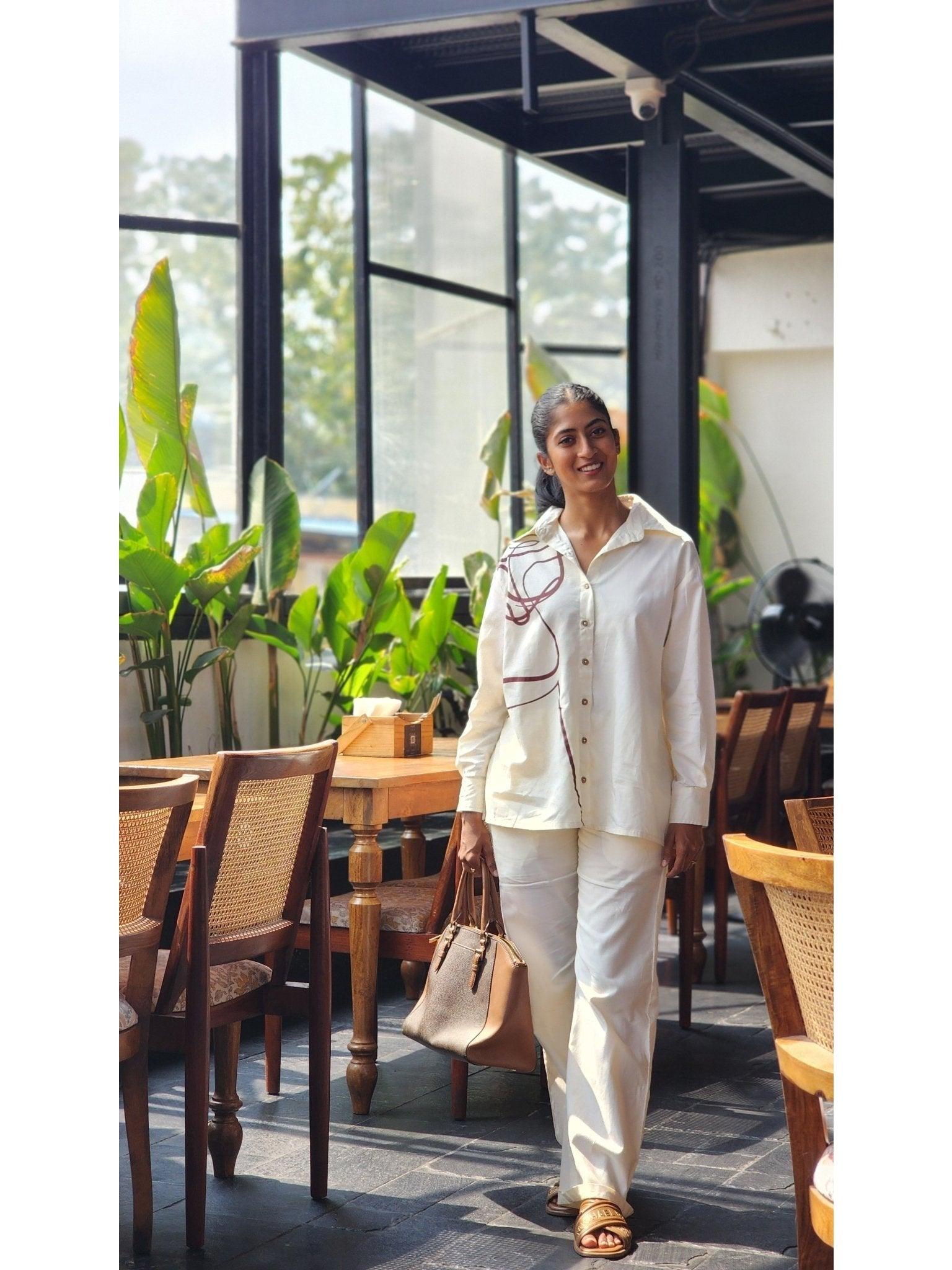 The Russet Co-Ord Set is a chic and comfortable ensemble that offers a relaxed fit and a classic look. Crafted from soft cotton satin in a soothing off-white hue. The pants feature side pockets for added convenience.