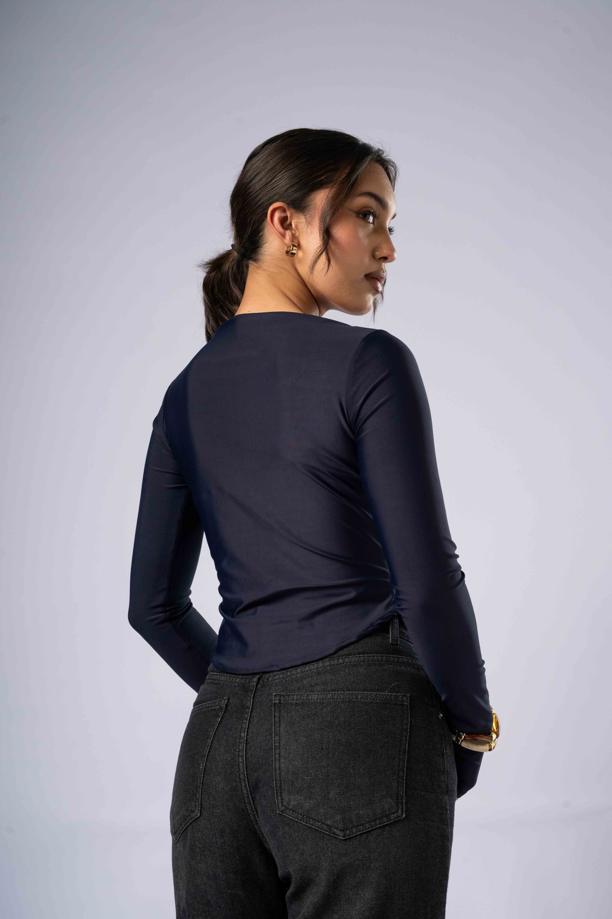 The Sapphire top is a sleek, body-sculpting full-sleeve top crafted from smooth stretch nylon. Designed with a minimal high neck, it offers a clean, athletic-chic look that fits like a second skin — perfect for workouts, layering or everyday elevated basics.